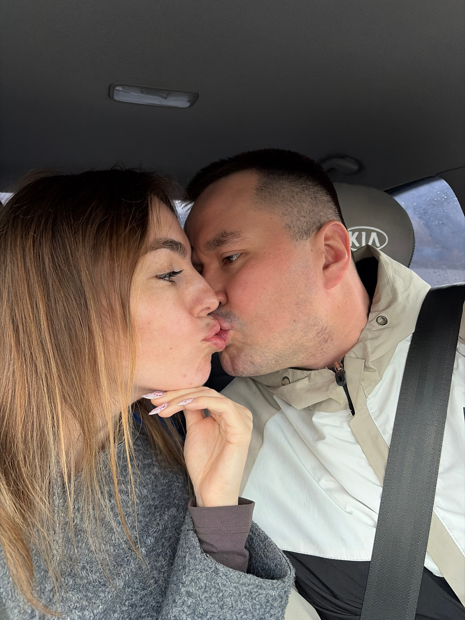 A couple is kissing in a car. The man has short, dark hair and is wearing a light-colored jacket. The woman has long, light brown hair and is wearing a gray sweater. They are both wearing seatbelts. A…read more