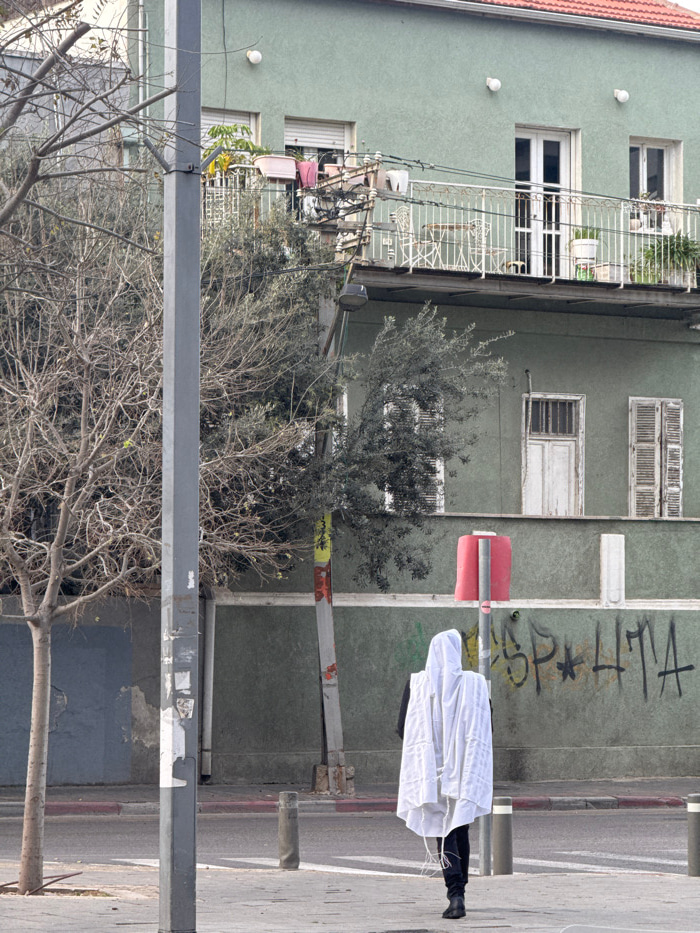 The image depicts an urban street scene in Tel-Aviv, Israel, featuring a person walking away from the viewer on a sidewalk in front of a building. The central figure is an individual, viewed from beh…read more