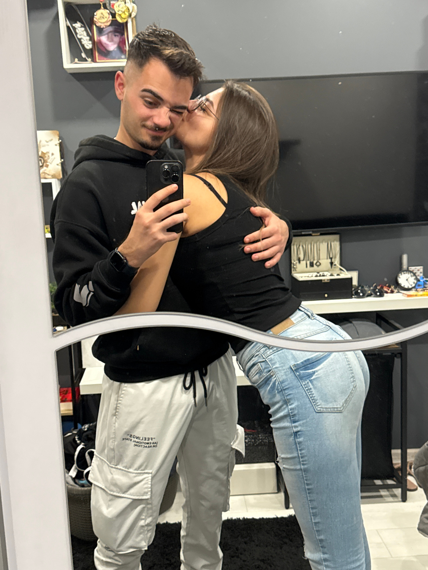 A couple is taking a selfie in a mirror. The man is holding the phone, and the woman is kissing him on the cheek. The man is wearing a black hoodie and white pants, and the woman is wearing a black toβ¦read more