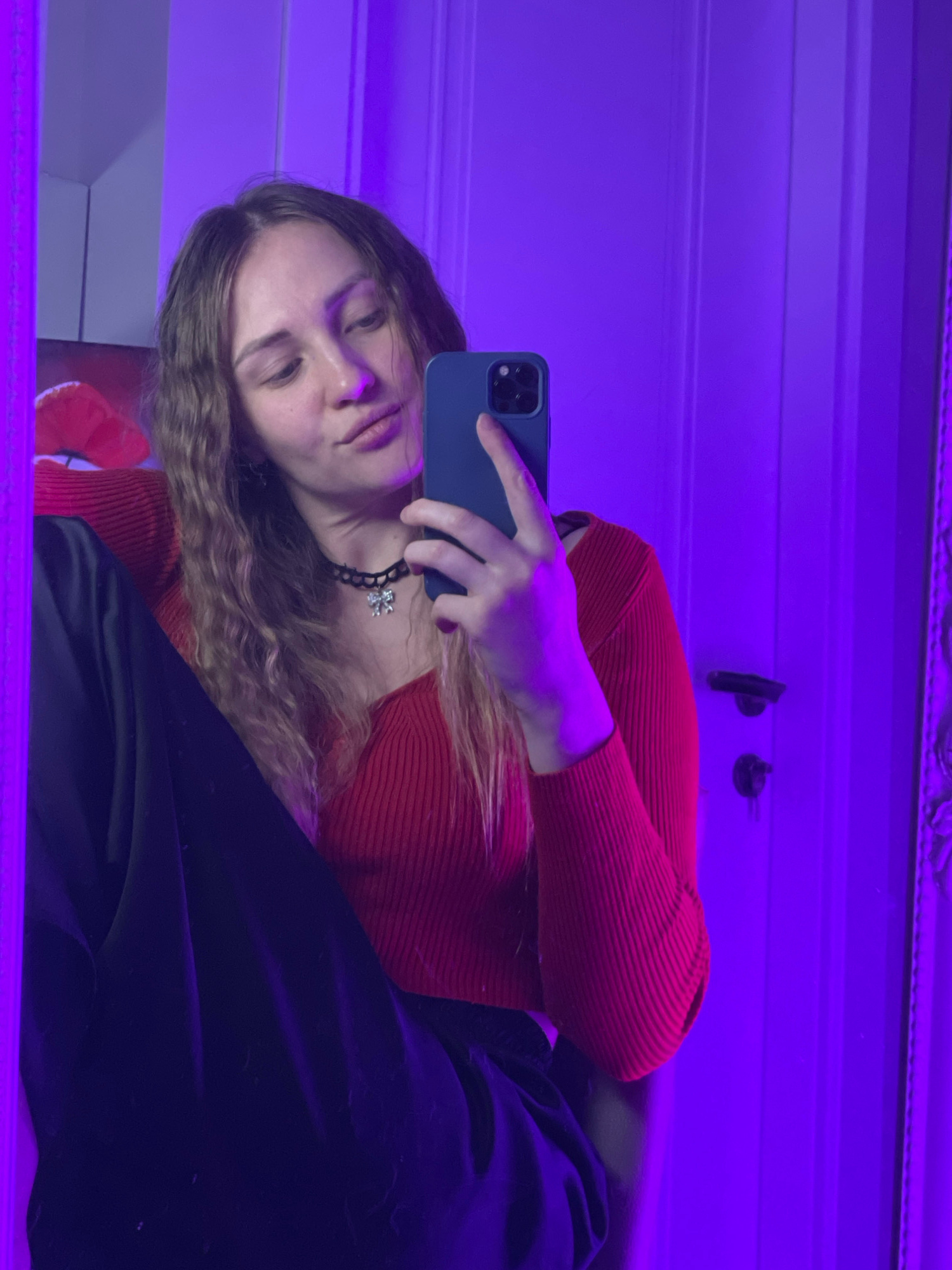 A young person takes a selfie with a blue mobile phone. They are wearing a red, long-sleeved, ribbed shirt and black pants. They also wear a black choker with a silver snowflake charm. The background…read more