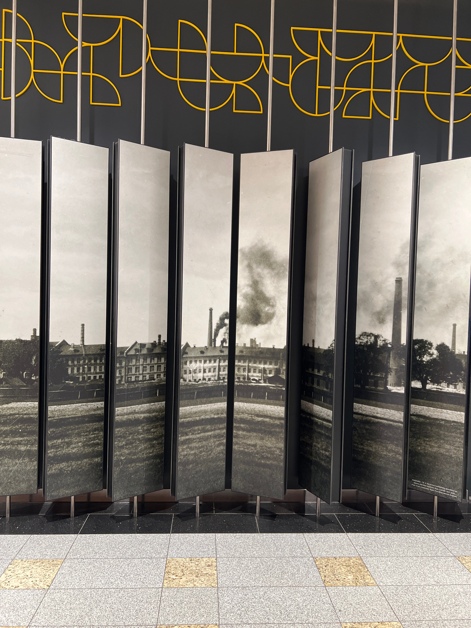 The media file captures an indoor architectural feature, likely a wall-mounted art or information display, complemented by a tiled floor. The image is taken from a slightly elevated perspective, looki…read more
