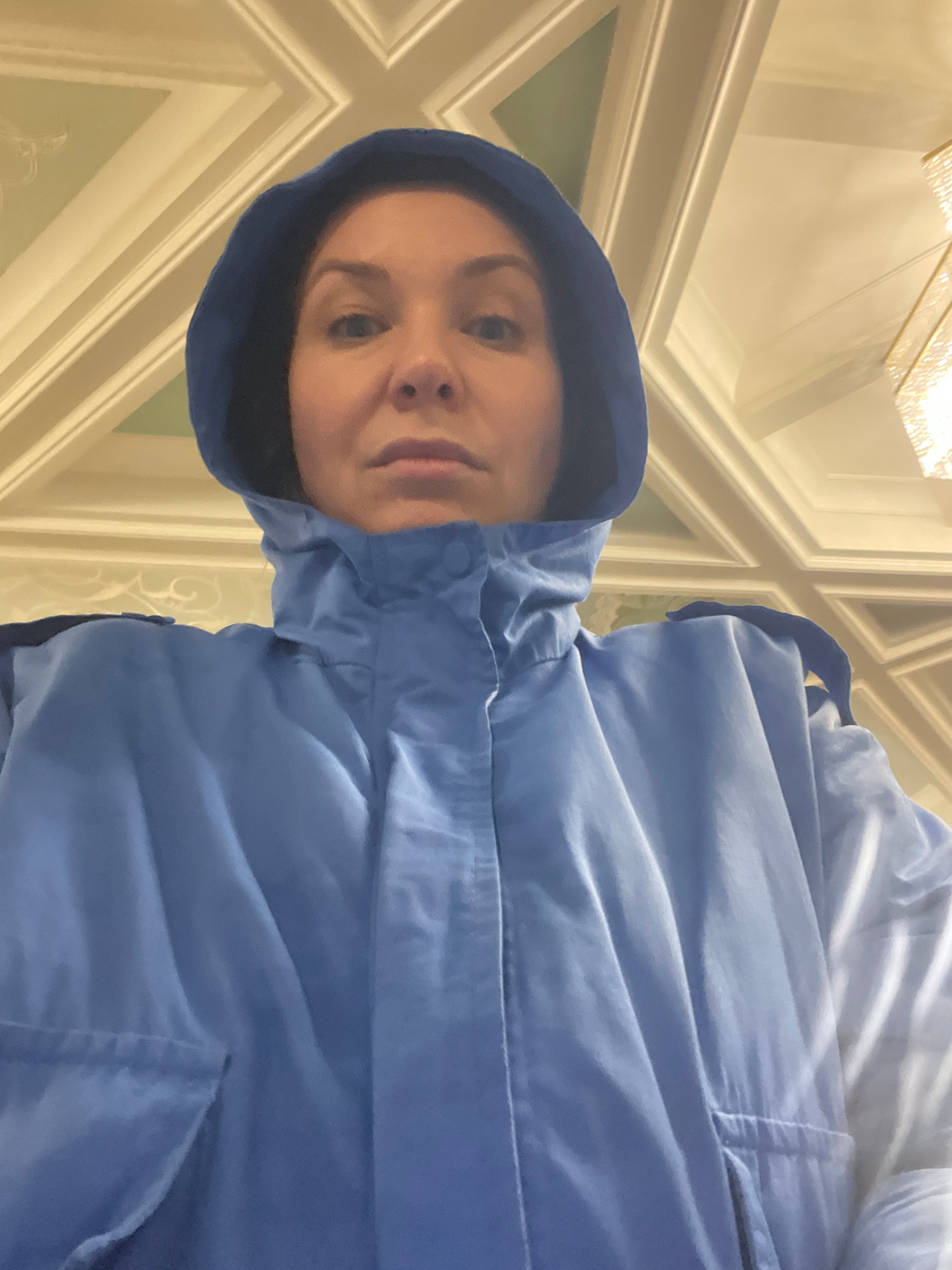 A selfie, possibly taken by a woman, shows her face framed by a blue hooded jacket. She has light skin and appears to be indoors. Behind her, the background includes a section of the ceiling and upper…read more