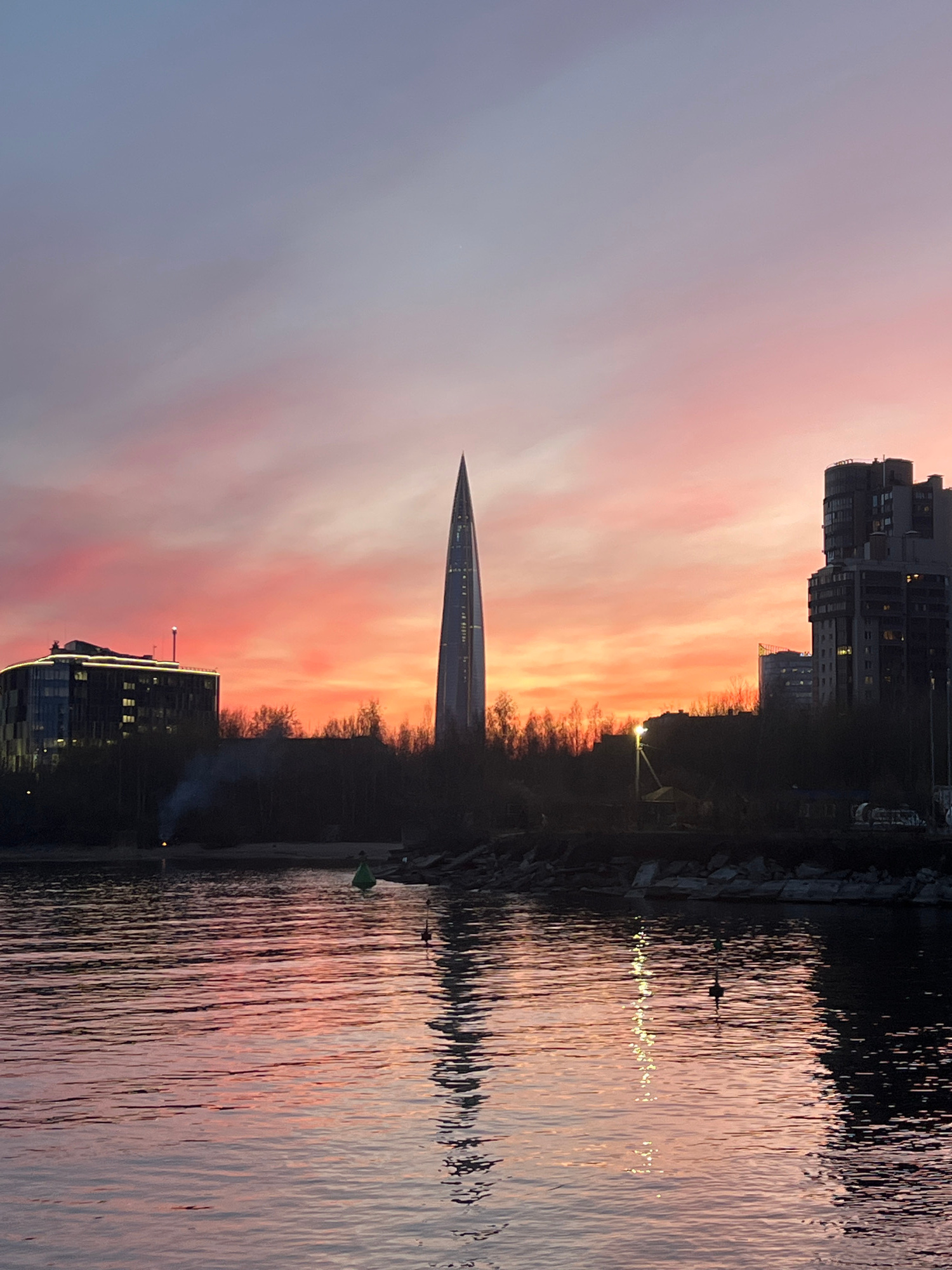 An evening view captures a tranquil scene over a body of water, likely a river or bay, at sunset or twilight. The sky dominates the upper portion of the image, showcasing a gradient of soft blue and p…read more