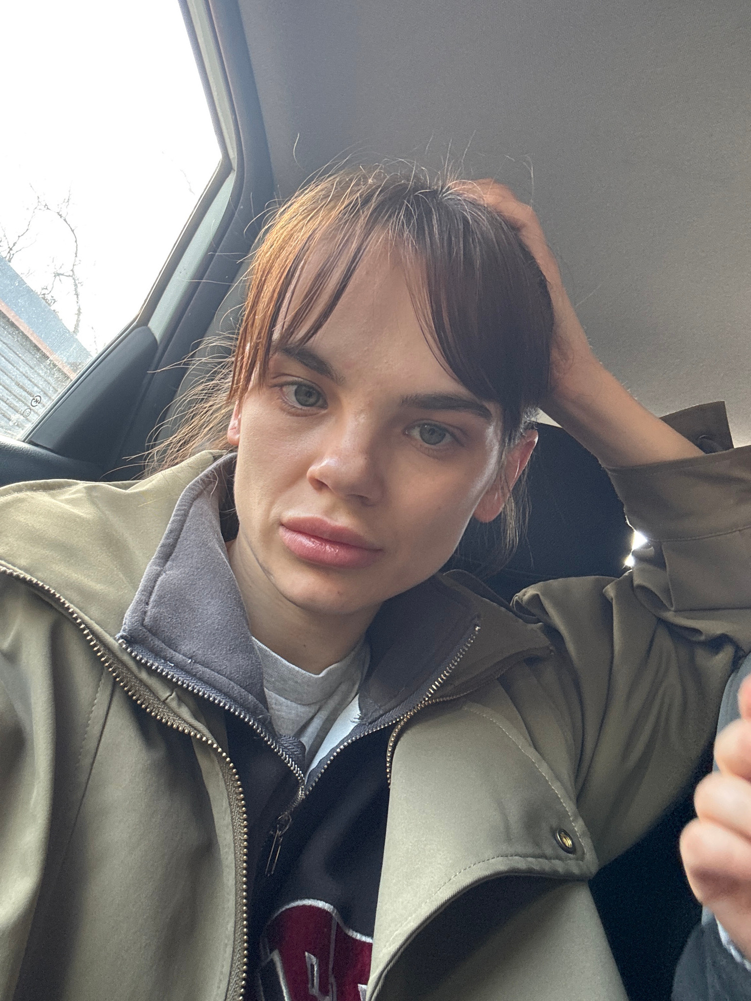 A person is inside a vehicle, possibly a car, as suggested by the window in the lower left corner showing a blurred view of a building and tree branches. The person is wearing a khaki-colored jacket w…read more