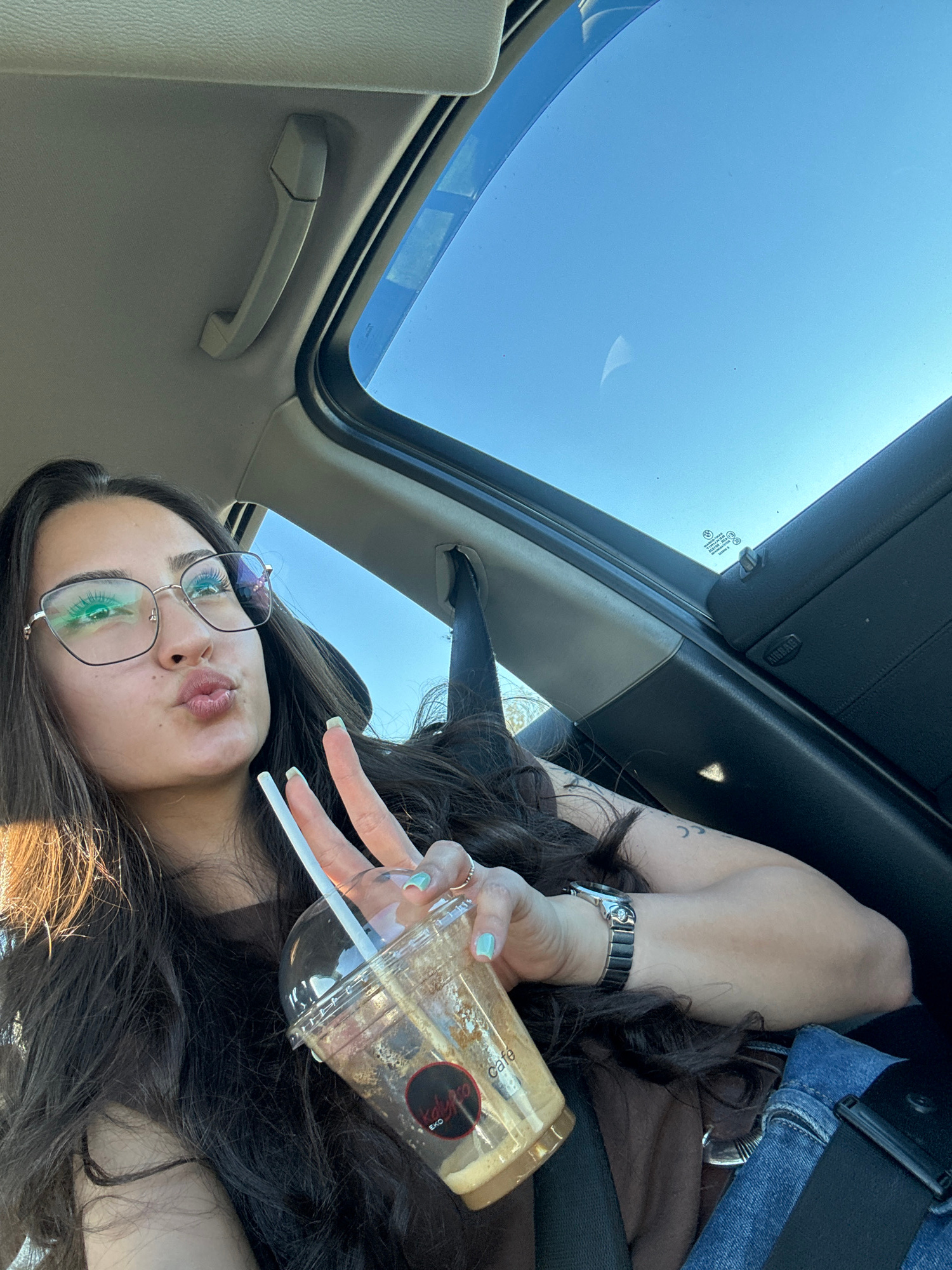 A woman is photographed from a low angle while inside a car with an open sunroof. The sky is visible through the sunroof. The woman has long, dark hair, wears glasses, and holds a plastic cup with a s…read more