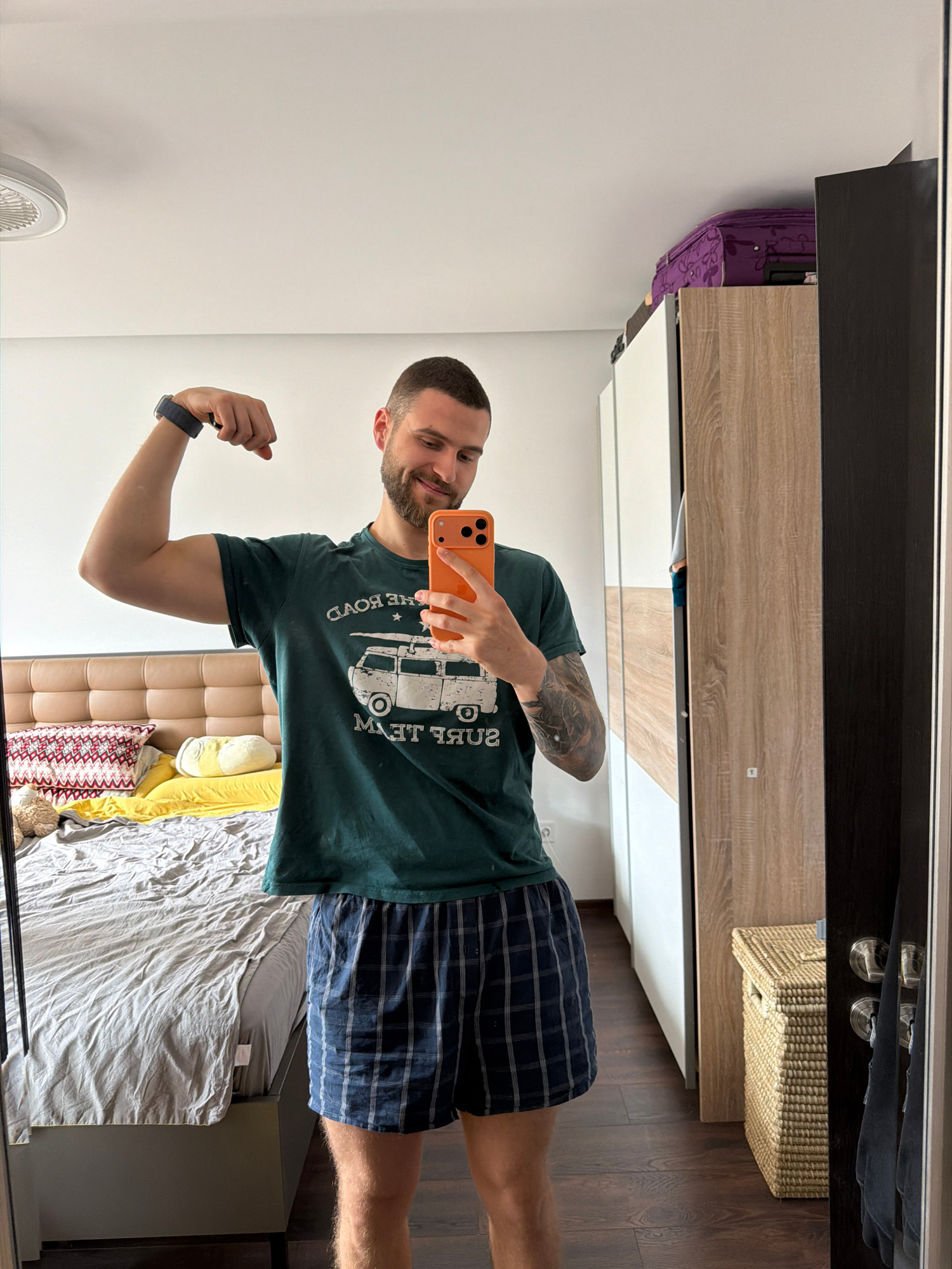 A man is taking a selfie in a mirror. The man is wearing a dark green t-shirt with a white graphic and plaid shorts. He is flexing his left arm and holding an orange smartphone in his right hand. The…read more