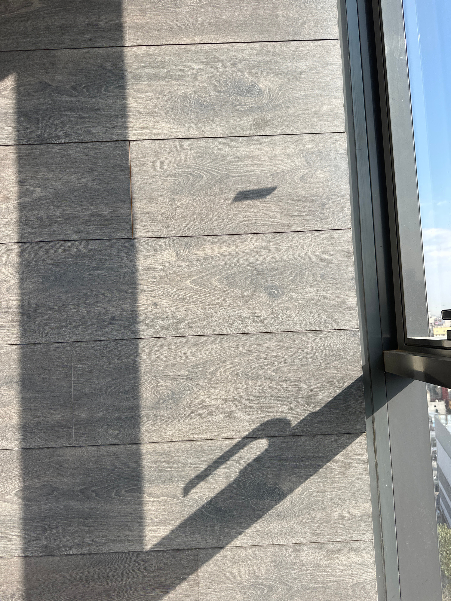 The image depicts a section of gray wood flooring next to a window with a metal frame. The window offers a partial view of a building and the sky. A shadow cast by the window frame and handle falls ac…read more