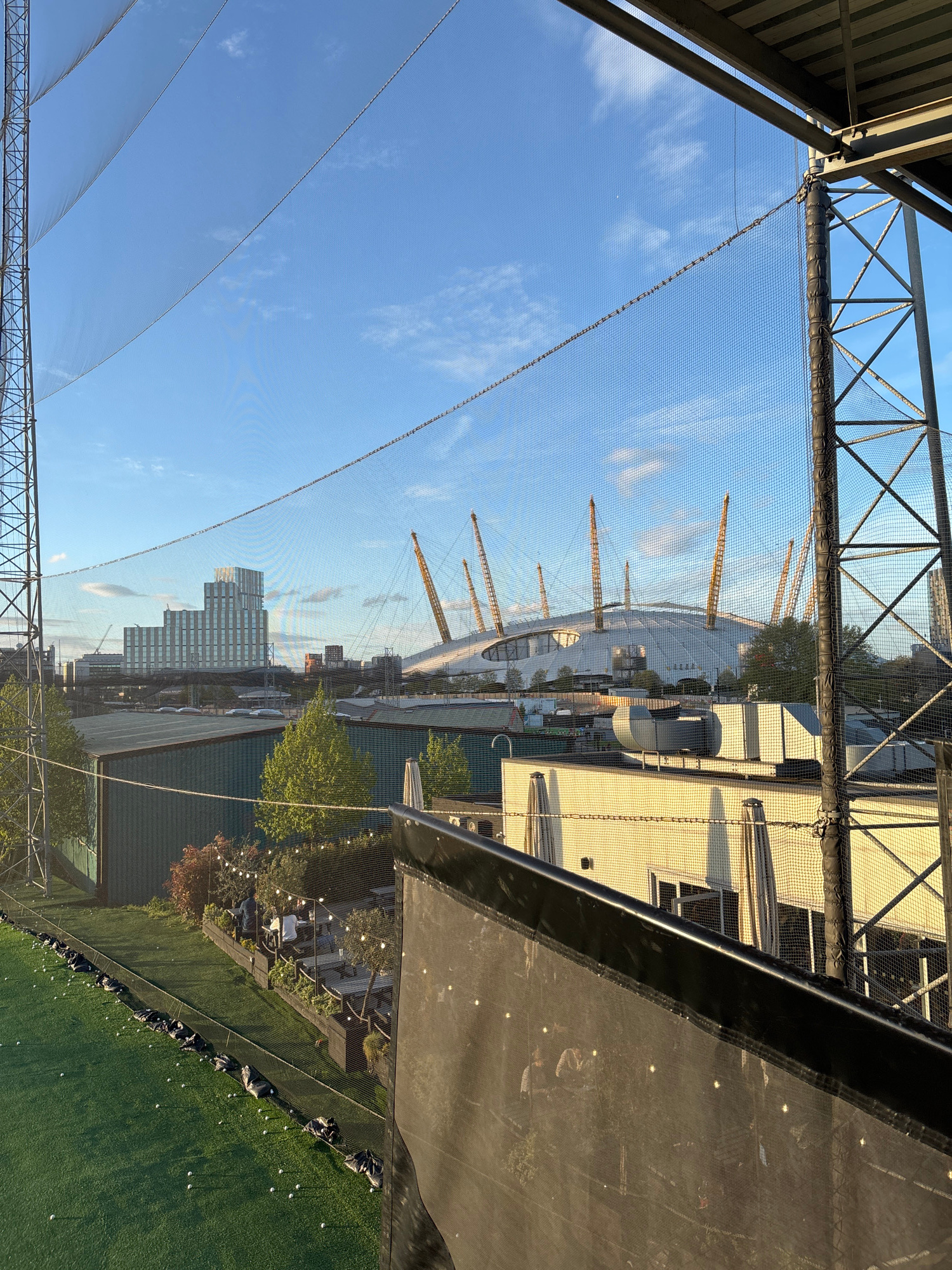 The original image is rotated 90 degrees clockwise. When viewed correctly, it presents an expansive outdoor scene from a golf driving range, offering a panoramic view of an urban landscape in London.…read more