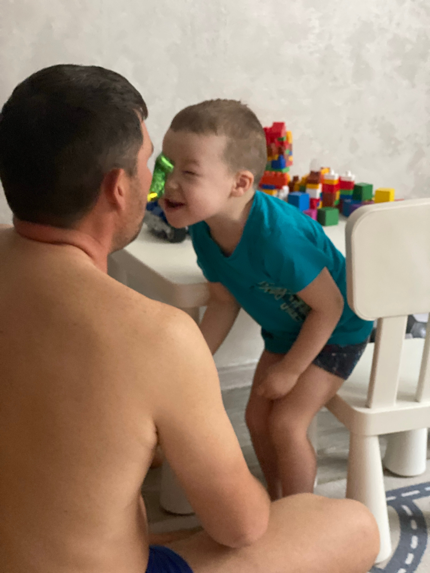 A man lies on his back while a child leans over him, likely interacting playfully. The man is shirtless and the child is wearing a blue shirt and dark shorts. The child appears to be laughing. A white…read more