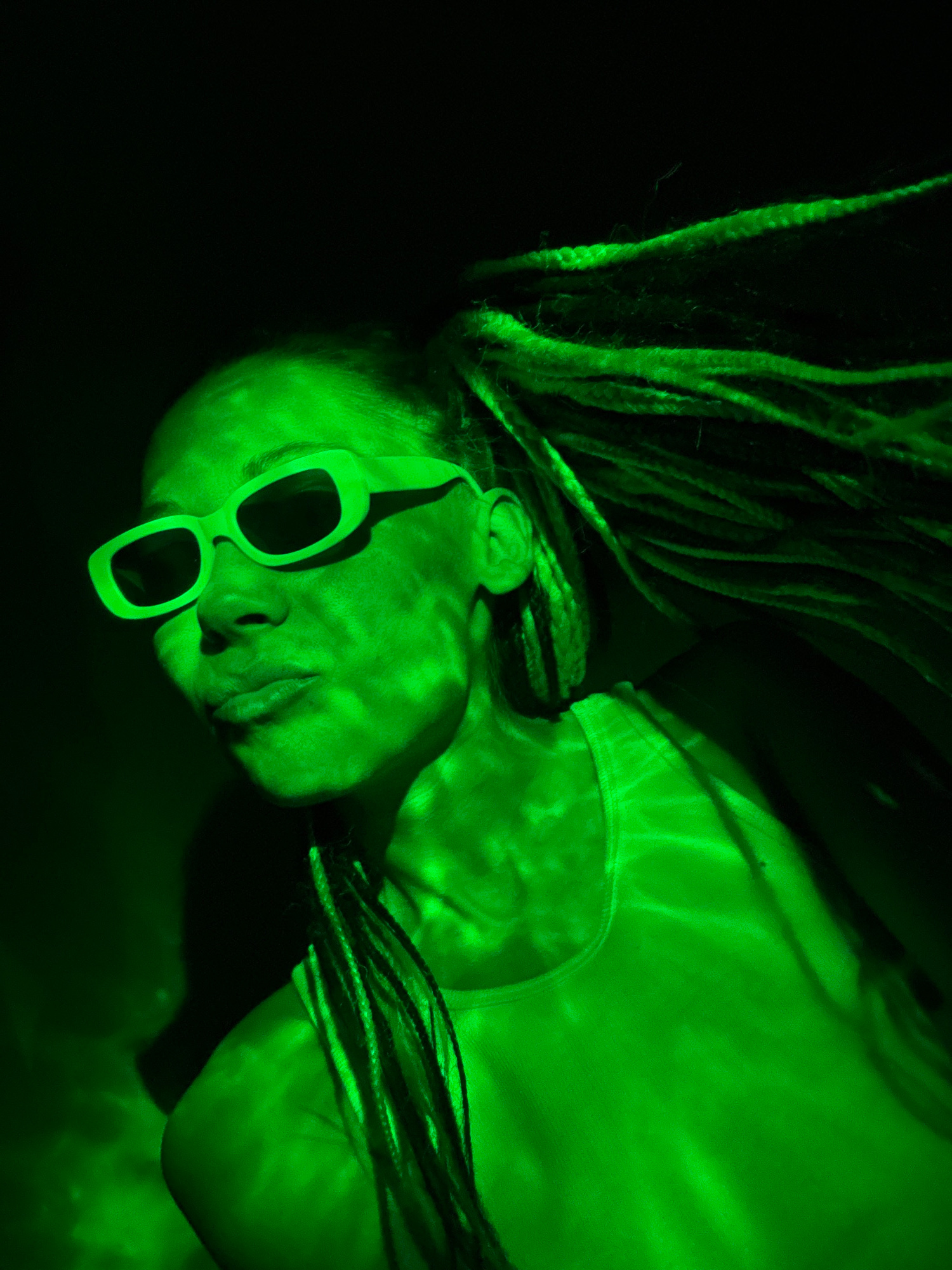 A medium shot of a person under a green light. The person is wearing dark glasses. The individual has dreadlocks and is wearing a tank top. The location is unknown.
