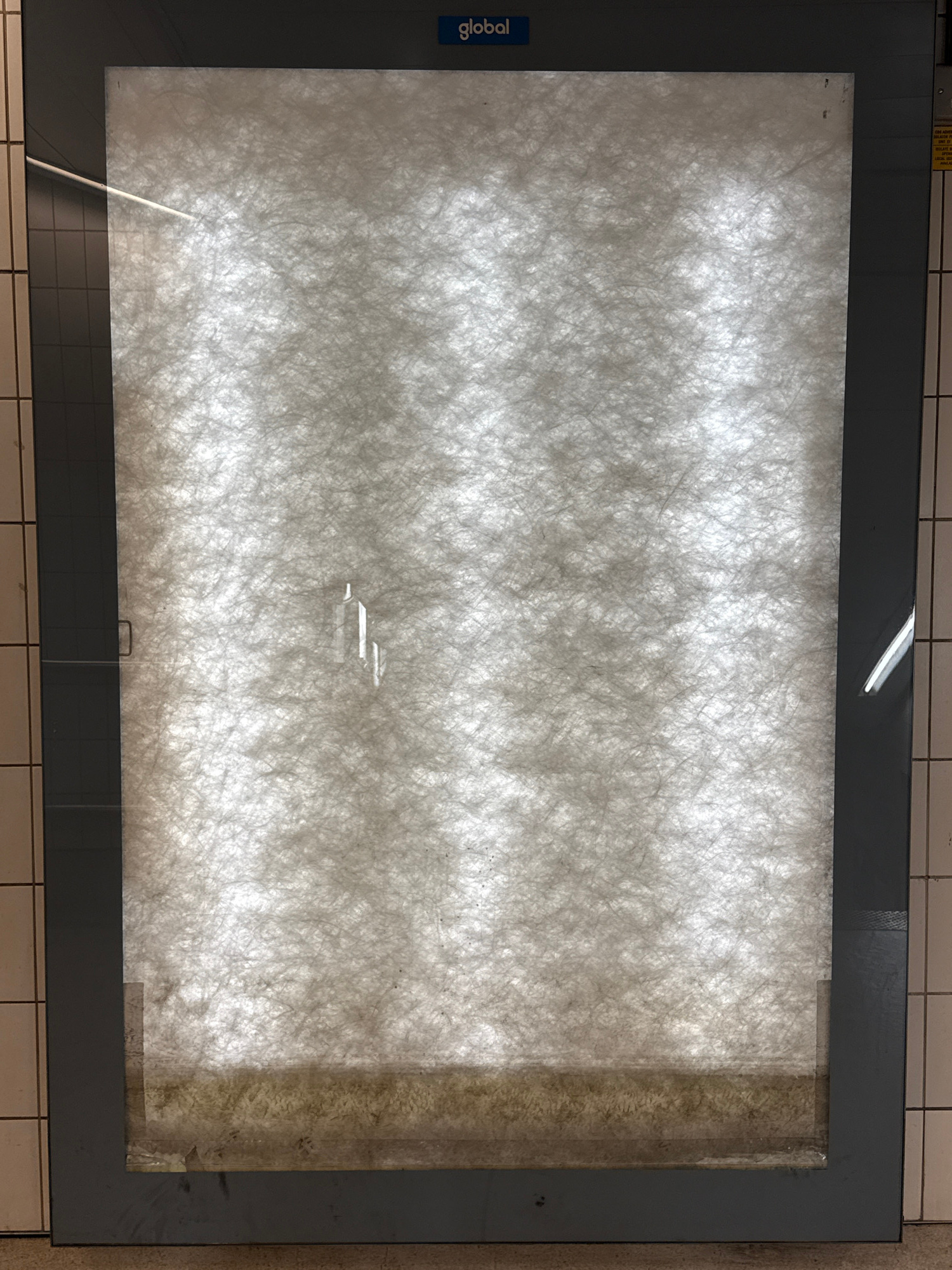 A gray-framed display case is mounted on a tiled wall. The case contains what appears to be a dirty air filter. The word "global" is written vertically in blue on the left side of the frame. The displ…read more