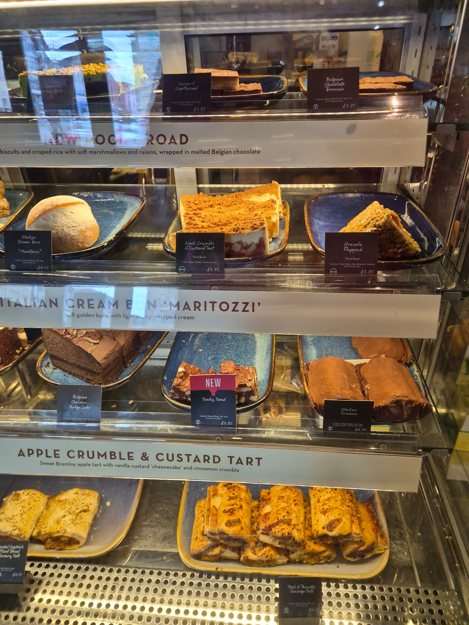 The media file captures a well-lit refrigerated display case filled with an assortment of cakes, tarts, and pastries, likely in a café or bakery. The scene is shot from a slightly elevated, eye-level…read more