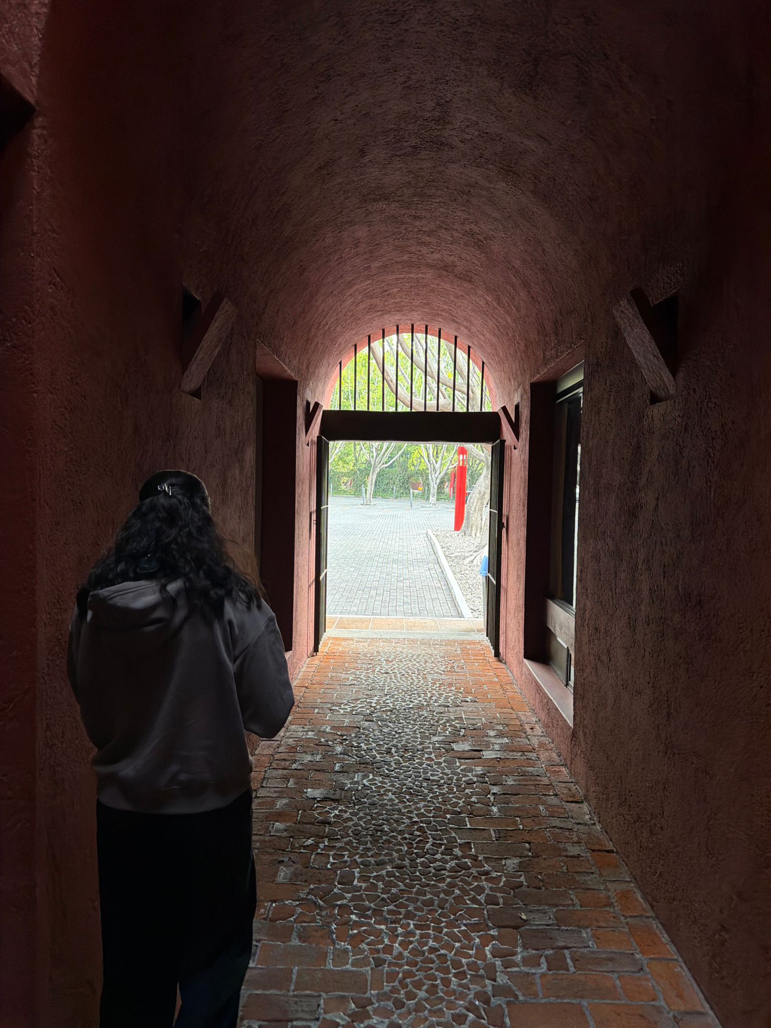 The image shows a person standing in what appears to be the Camelia Pasaje, a building in the city of Puebla, Mexico. The interior space has a rounded wall made of a rough, red-toned material. A windo…read more