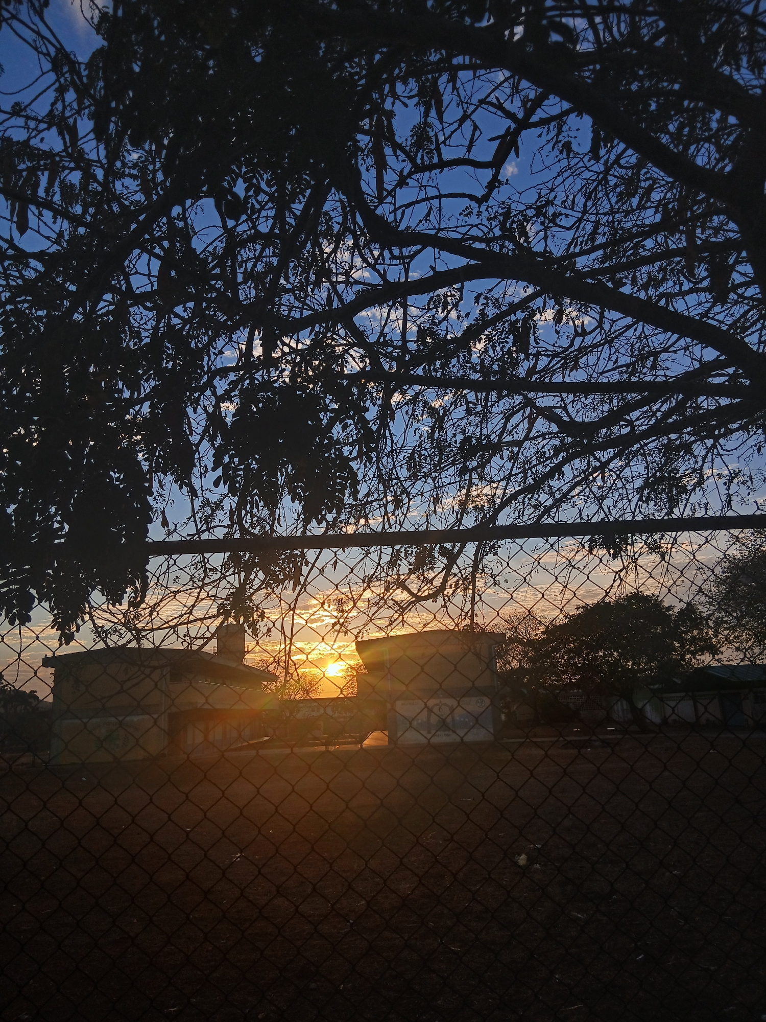 A low-angle shot captures a scene in Juan Griego, Venezuela. On the left, the silhouettes of tree branches and leaves fill the frame, contrasted against a backdrop of blue sky with scattered white clo…read more