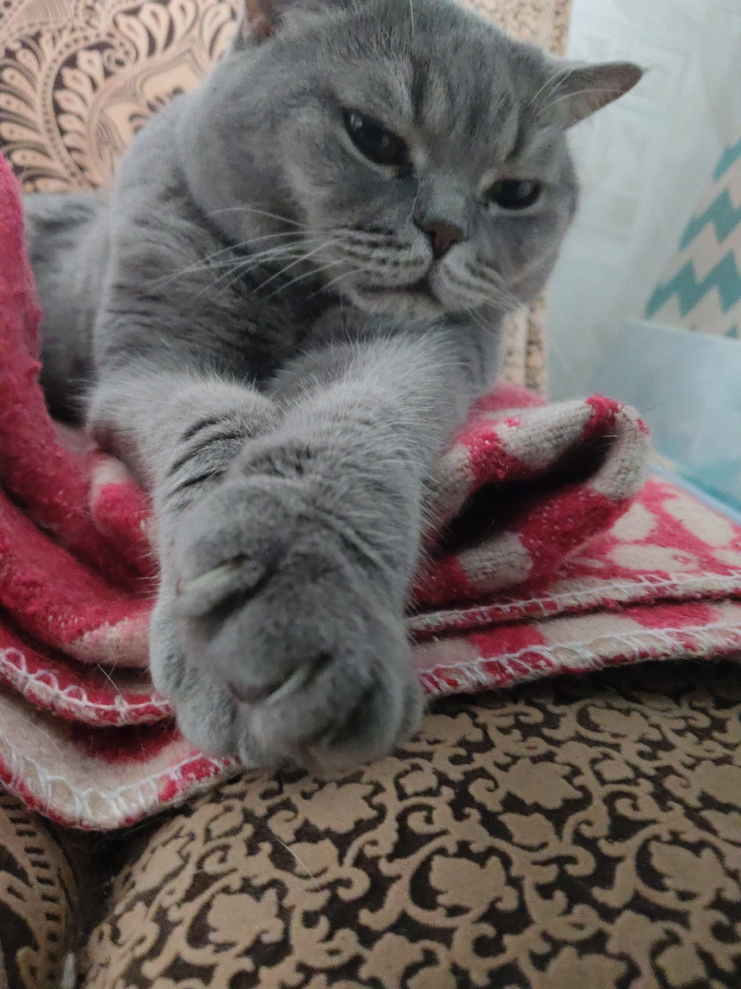 A grey, short-haired cat with crossed paws rests on a patterned brown and tan couch. A red and beige patterned blanket is underneath the cat's paws. The cat is looking toward the viewer with a slightl…read more