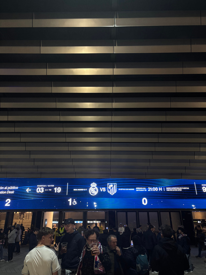 The image depicts an exterior view of the Santiago Bernabéu Stadium in Madrid, Spain, at night. A large crowd of individuals, predominantly adults, is gathered in the foreground beneath a prominent horizontal blue LED screen integrated into the stadium's facade. The screen displays match information, including the fixture "REAL MADRID C.F. VS ATLÉTICO DE MADRID", "JORNADA 29 / MATCHDAY 29", a match time of "21:00 H", and "19:30 H APERTURA DE PUERTAS / 7:30 PM GATES OPEN". It also indicates "PUERTAS / GATES 03 A / TO 19". The stadium architecture above the screen features multiple horizontal, light-colored panels, possibly metallic, forming a modern facade. Numerous individuals in the crowd are holding clear plastic cups containing beverages. One man in the central foreground is wearing a red and white striped scarf, consistent with team colors. The scene is illuminated by artificial lighting, primarily from the bright blue LED screen, which casts a blue glow upon the people and the immediate environment. The individuals are standing and congregating, indicating a pre-event gathering outside the stadium entrance. | Open Wire