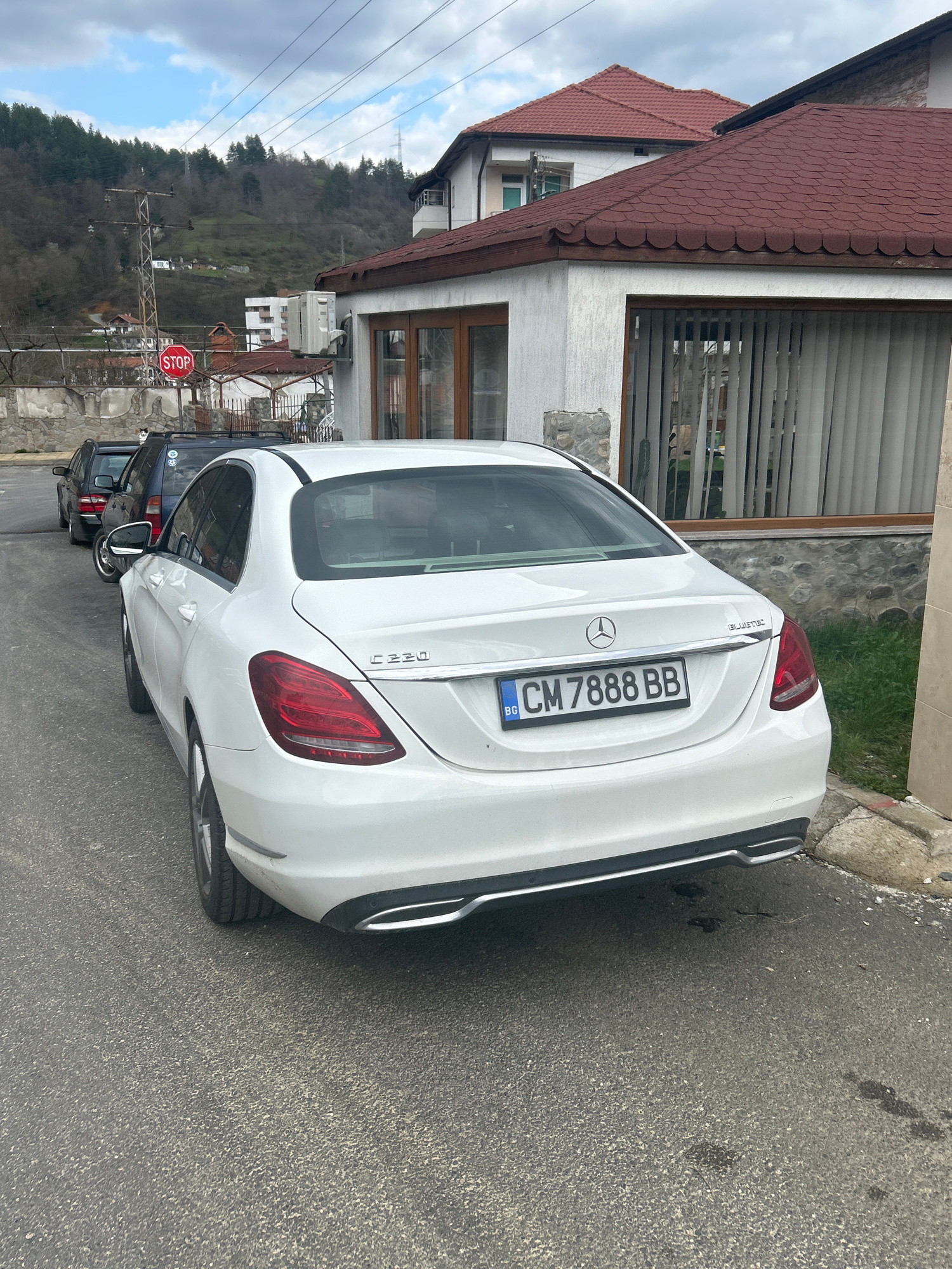 The image shows a white Mercedes-Benz C 220d car parked on a street in Zlatograd, Bulgaria. The car's license plate reads "CM 7888 BB." The rear of the car is facing the viewer. Behind the Mercedes, t…read more