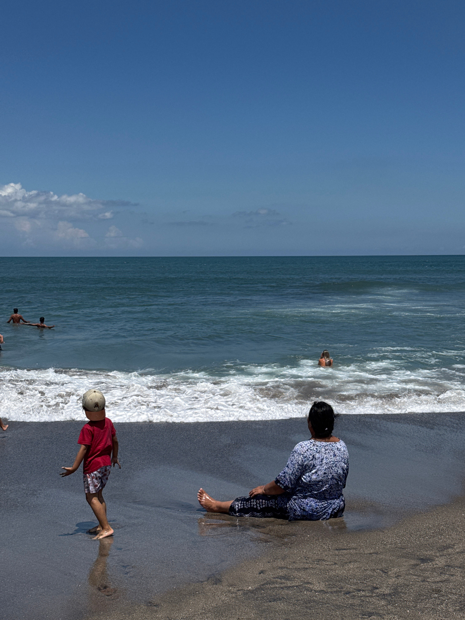 The image captures a scene on a beach. A woman in a patterned blue top and dark pants stands at the edge of the water. A young boy in a red shirt and patterned shorts plays near the water's edge. Othe…read more