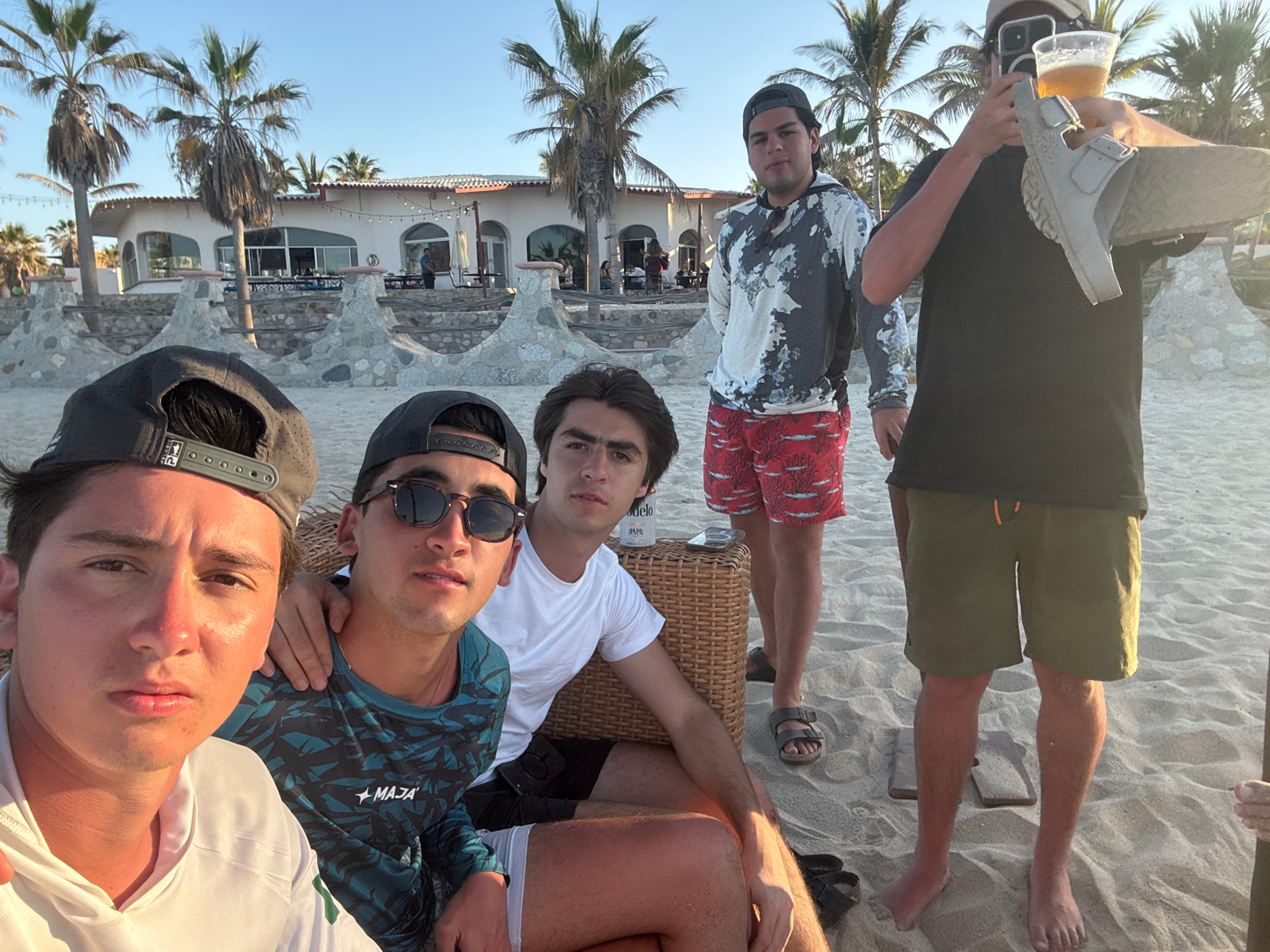 The image depicts a group of five young men posing for a picture outdoors. The scene appears to be at a beach resort in Buenavista, Mexico. Four of the men are visible from the torso up, while one is…read more