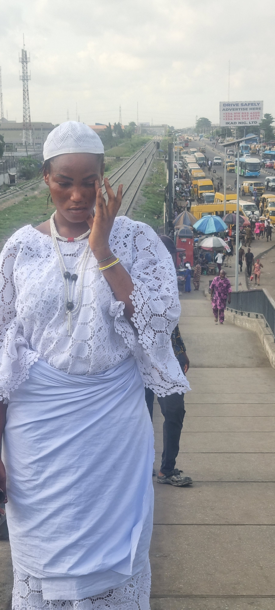 A woman in a white lace top, head covering, and wrapped cloth stands on a concrete overpass in Ikeja, Nigeria. Behind her, a busy street with yellow buses and other vehicles is visible, along with a l…read more