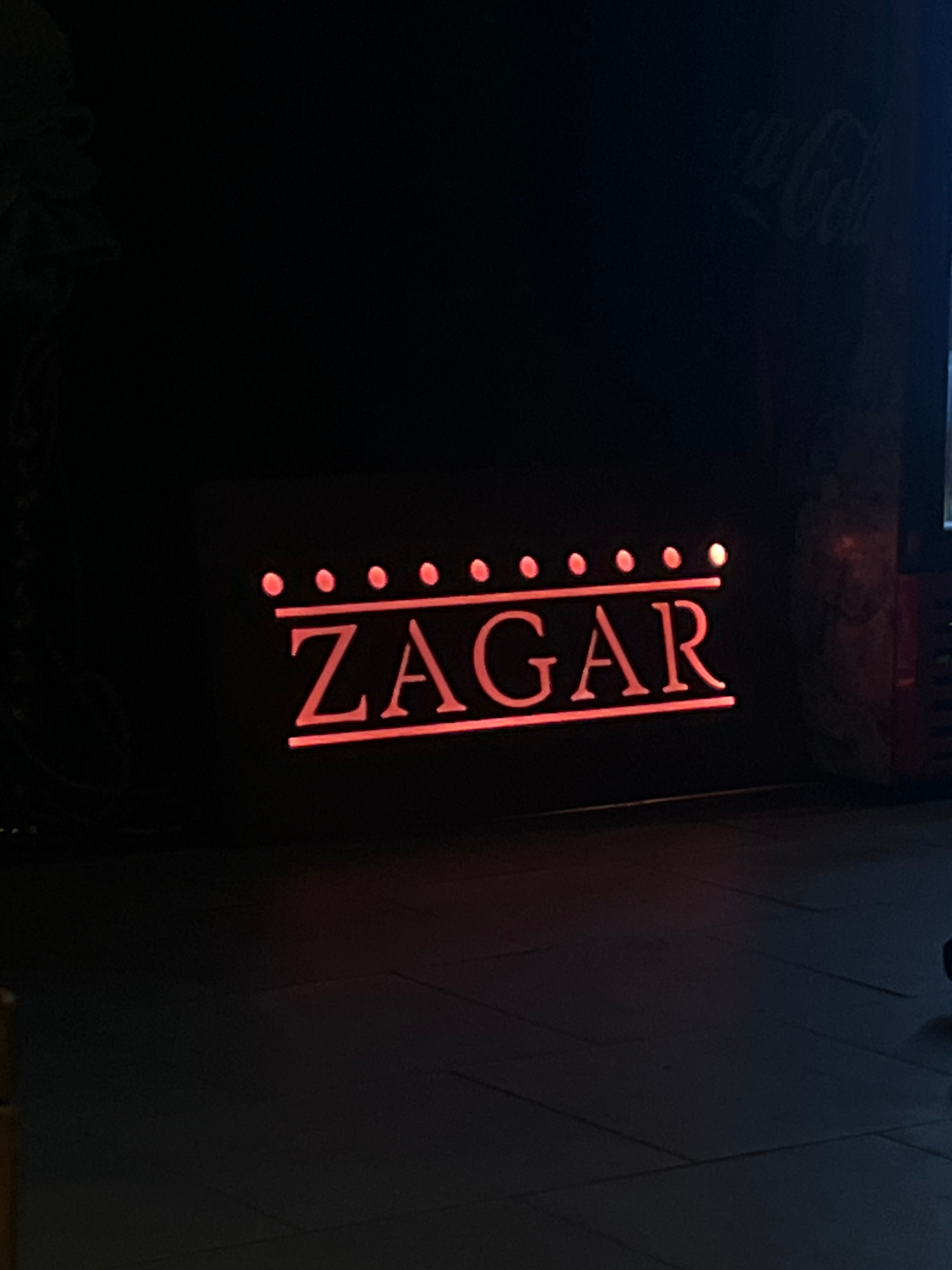 The image displays a dimly lit scene featuring a vertical neon sign on a dark background. The central subject is the illuminated sign, which spells out the word "ZAGAR" in a stylized, reddish-orange f…read more