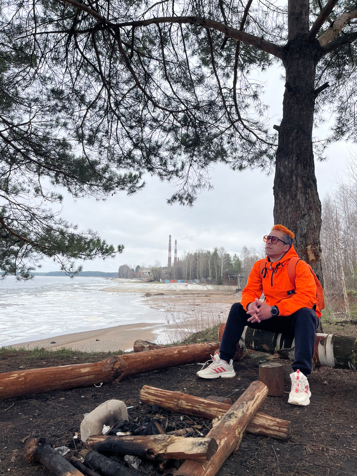 A person with orange hair and glasses, wearing an orange jacket and dark pants, is sitting on a wooden structure near a beach. The location is identified as Chaikovsky, Russia based on the two chimney…read more