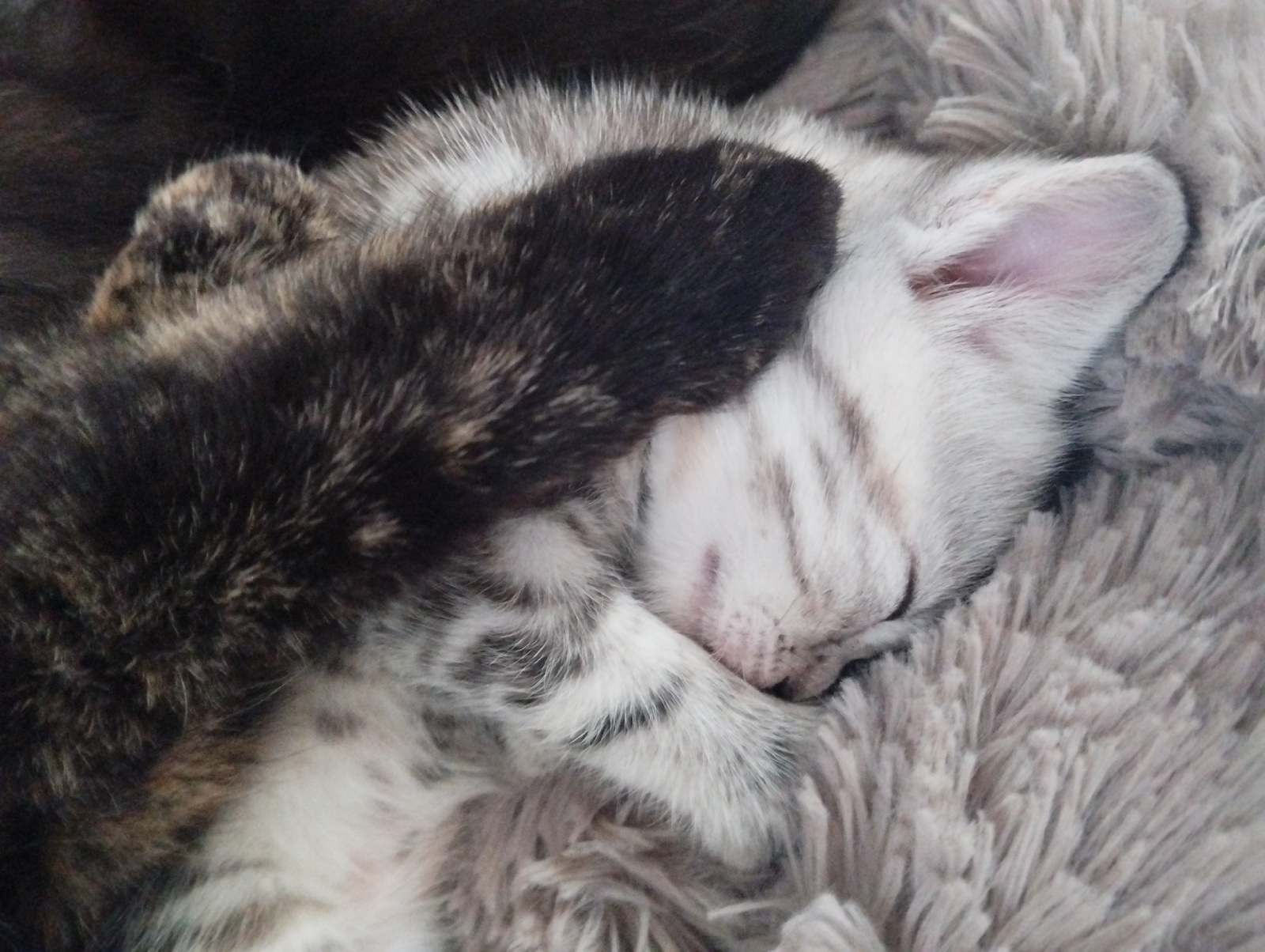 Two kittens are sleeping on a gray, fluffy blanket. One kitten is silver-gray with black stripes and is lying on its side, with its face and paws covered by the other kitten, which is black with some…read more