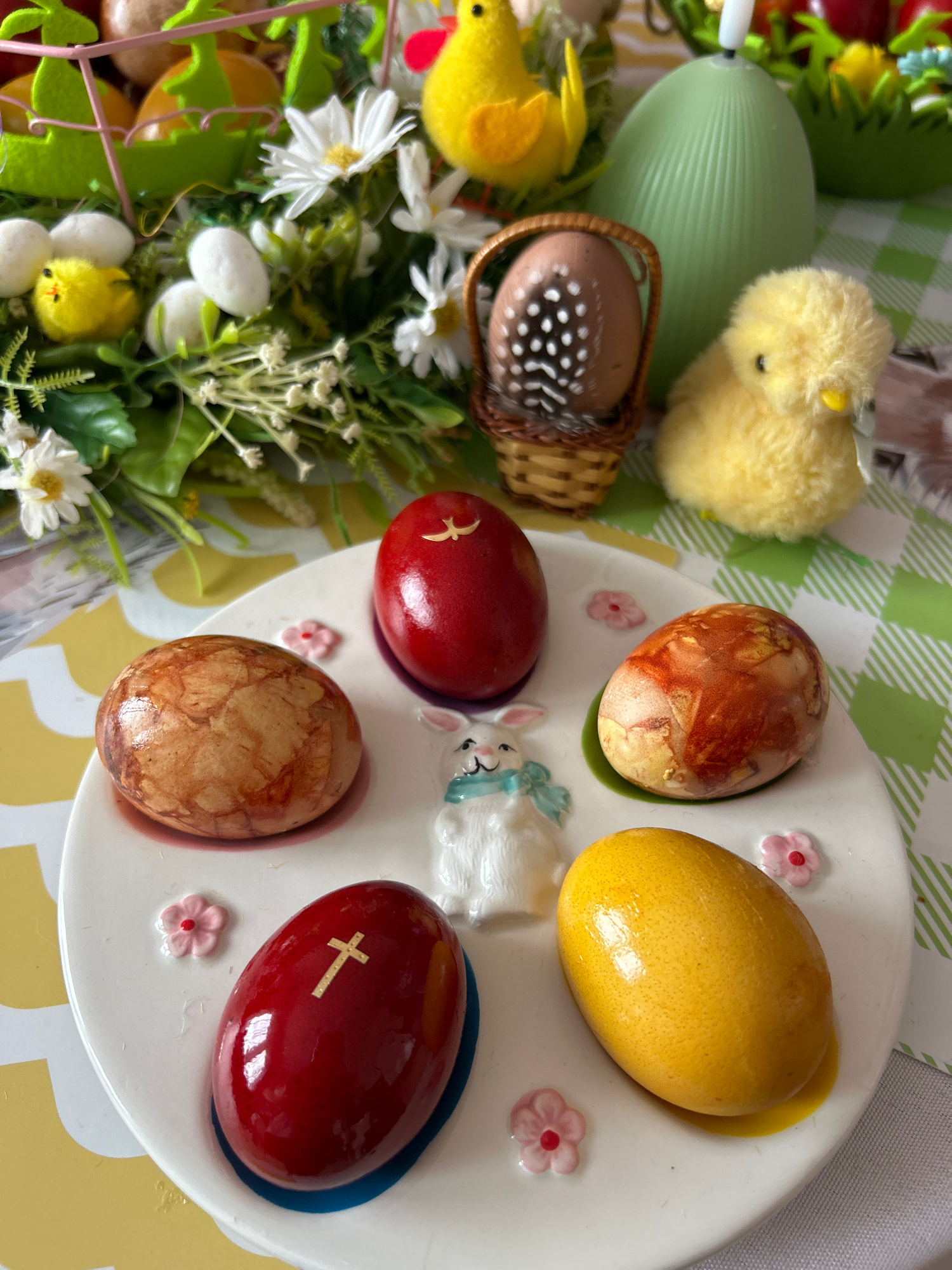 The image shows an Easter scene. On a white plate with decorative pink flowers, there are five decorated eggs. The eggs are colored in shades of yellow, brown, and red. One red egg has a gold-colored…read more