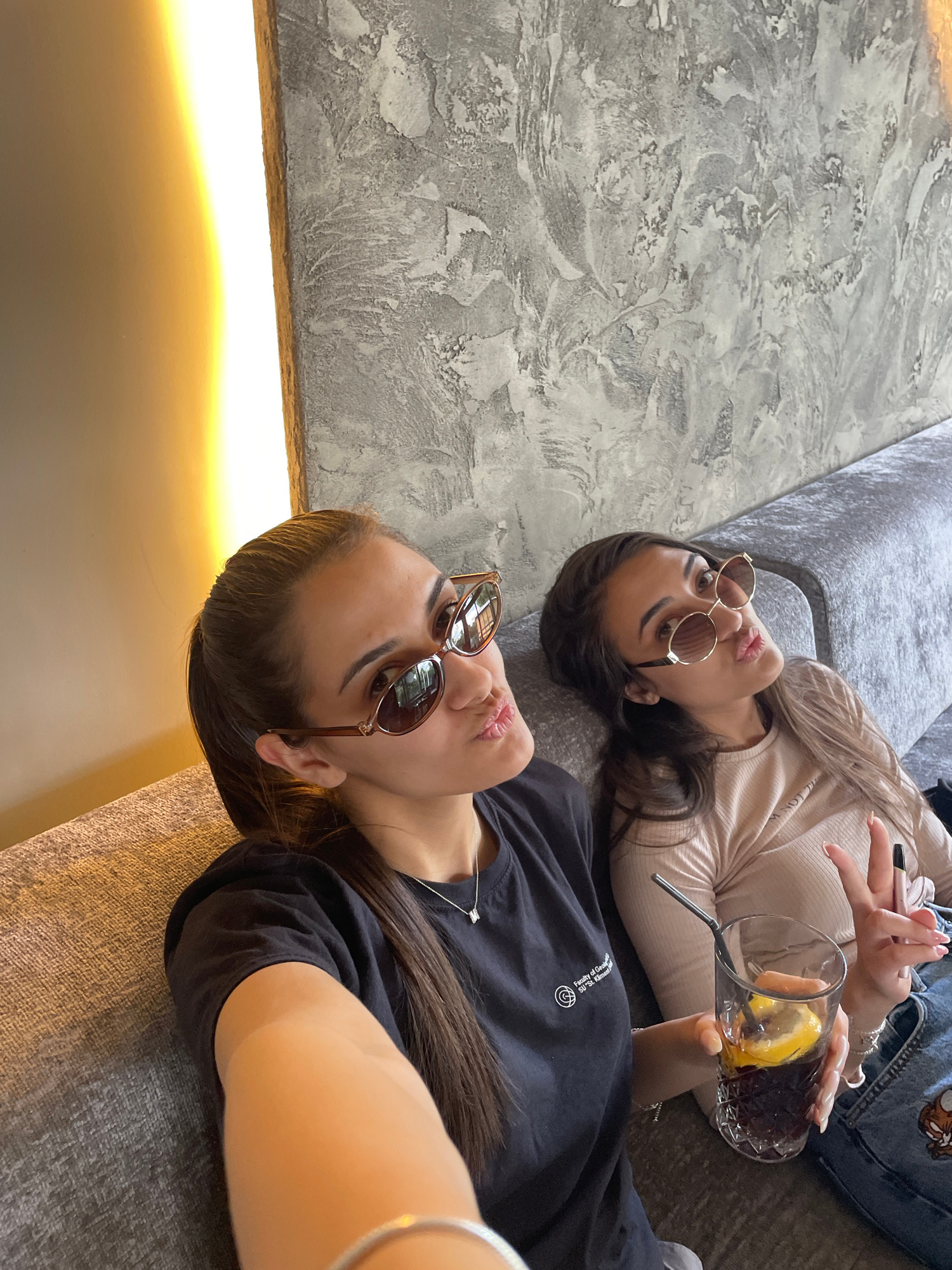 This indoor photograph, taken in Gotse Delchev, Bulgaria, captures two young women casually lounging on a grey, textured sofa. The image is taken from an overhead, diagonal perspective, suggesting a s…read more