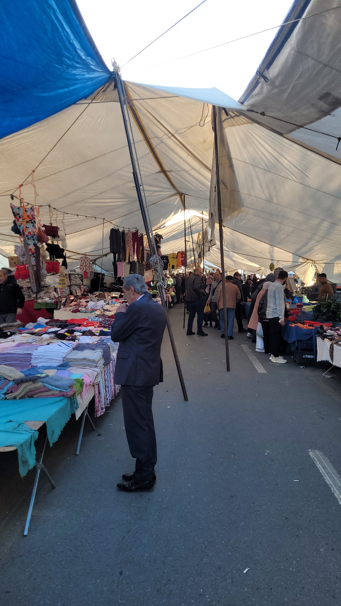 An outdoor marketplace in Beylikdüzü, Turkey, shows a man in a dark suit and black shoes examining merchandise on a table, his head bent low. The table is piled with clothes and textiles in a variety…read more