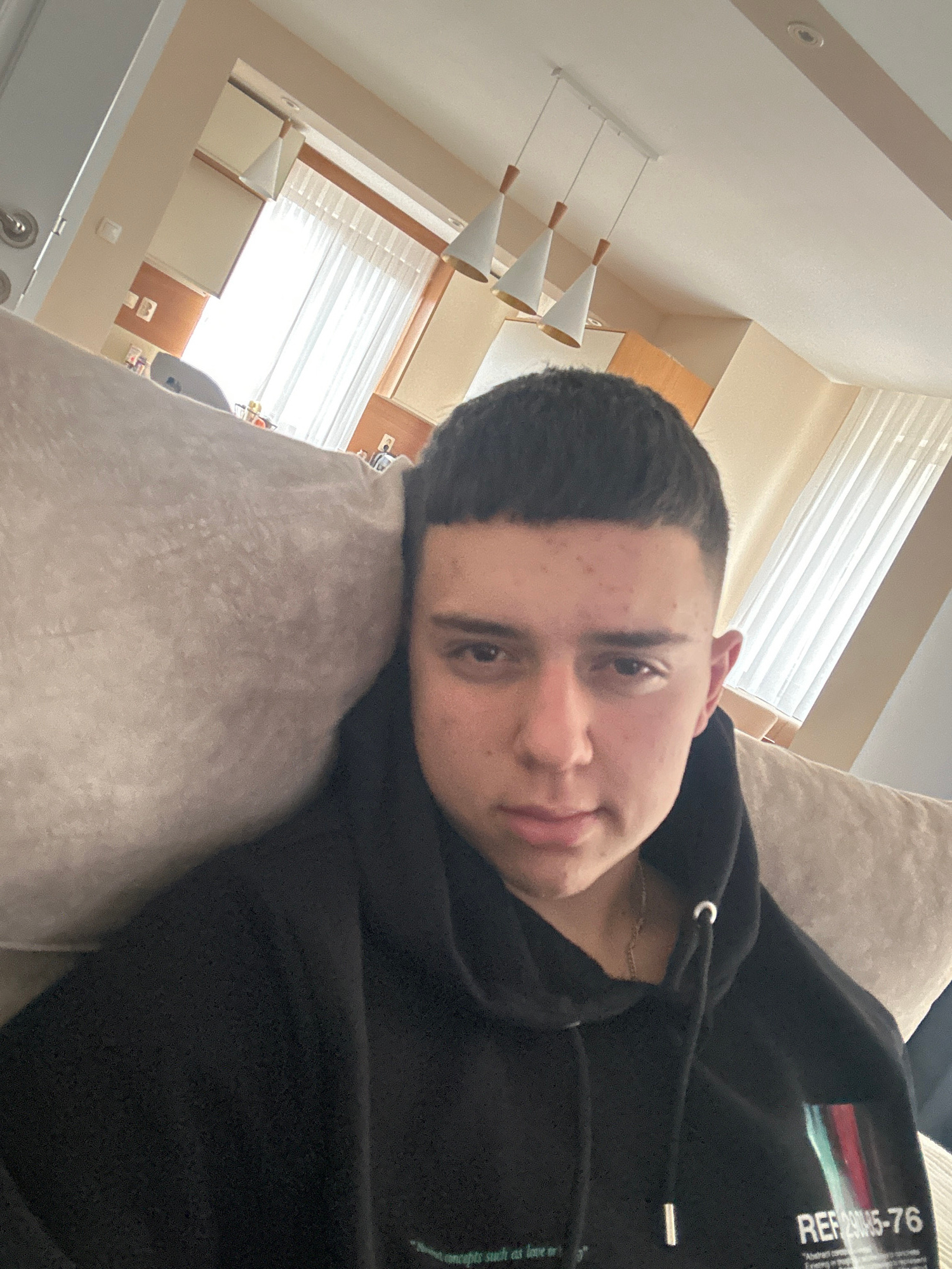 A person is reclining on a light-colored couch. The person has short, dark hair and is wearing a black hoodie with white text. In the background, there is a window with white blinds and a multi-light…read more