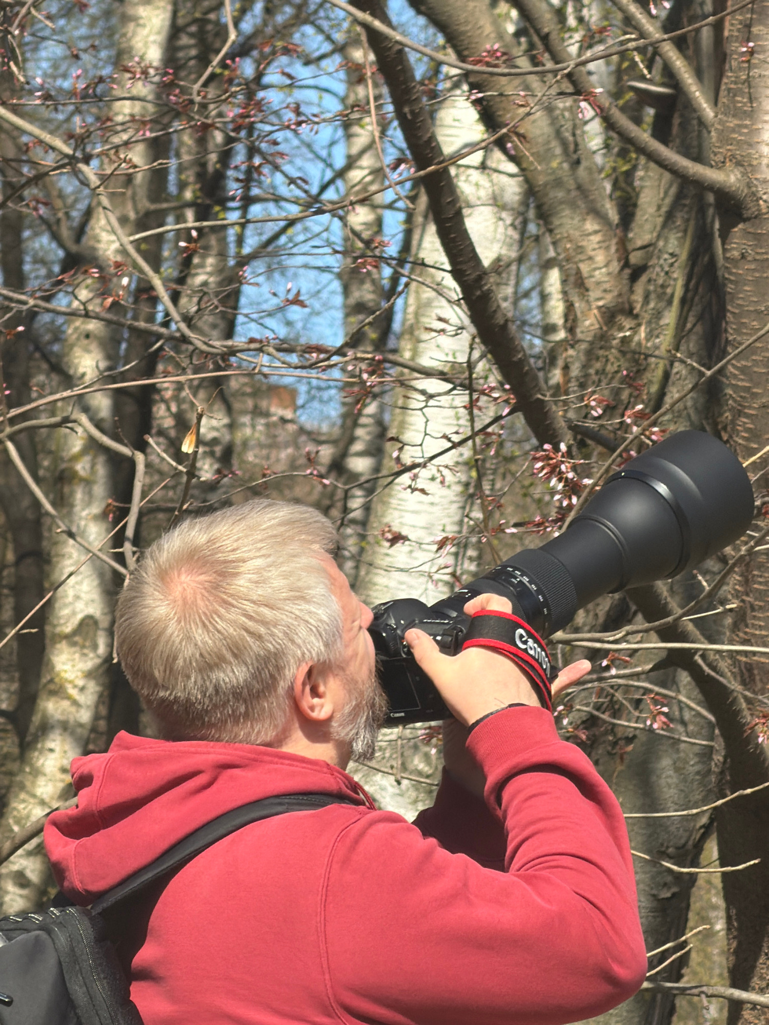 The image captures a male photographer from an elevated perspective, looking upwards into a tree canopy. He has light-colored hair and a beard and is wearing a red long-sleeved shirt. He holds a large…read more