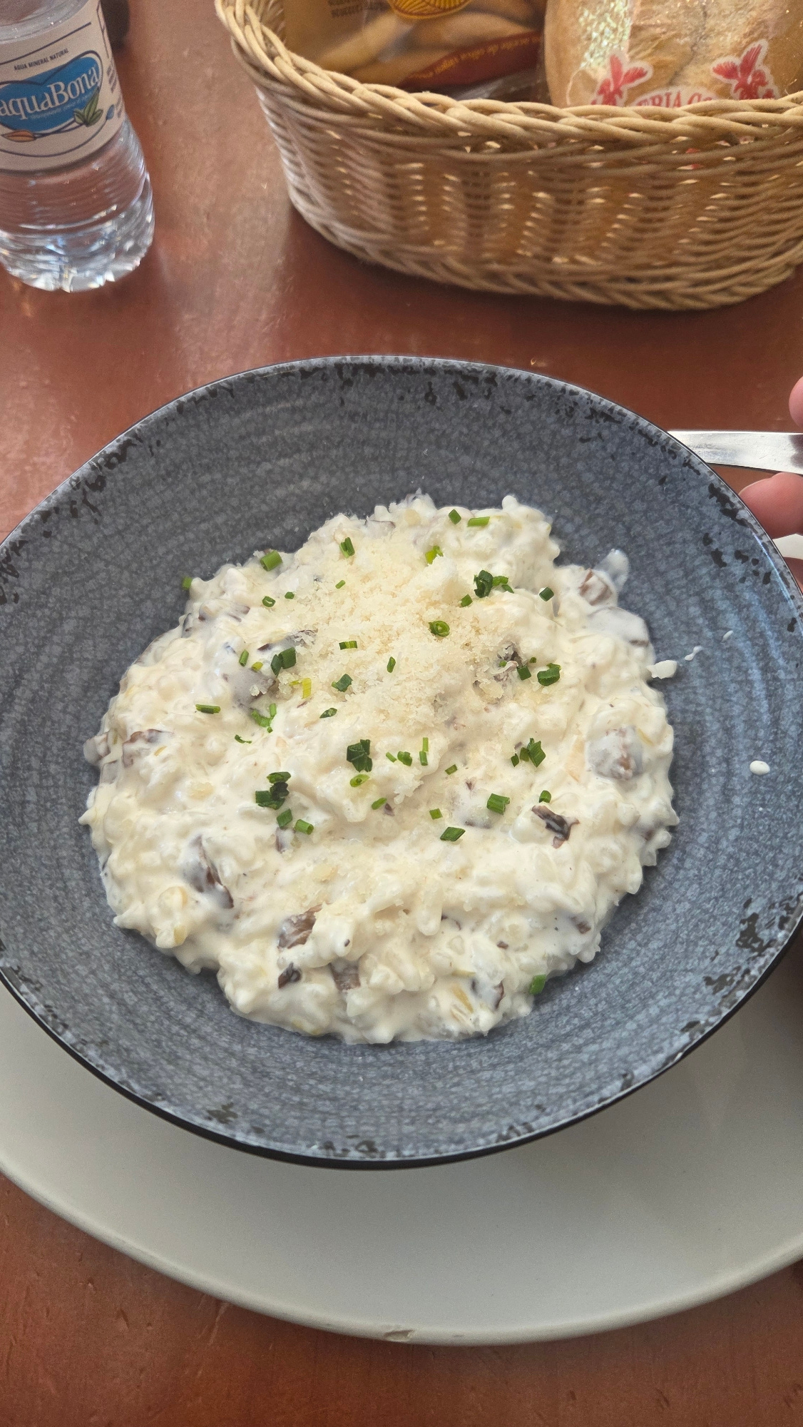 The image captures a close-up, elevated view of a dining table scene in a restaurant or cafe, specifically identified as being in Sevilla, Spain. The primary subject is a dark grey, textured ceramic b…read more