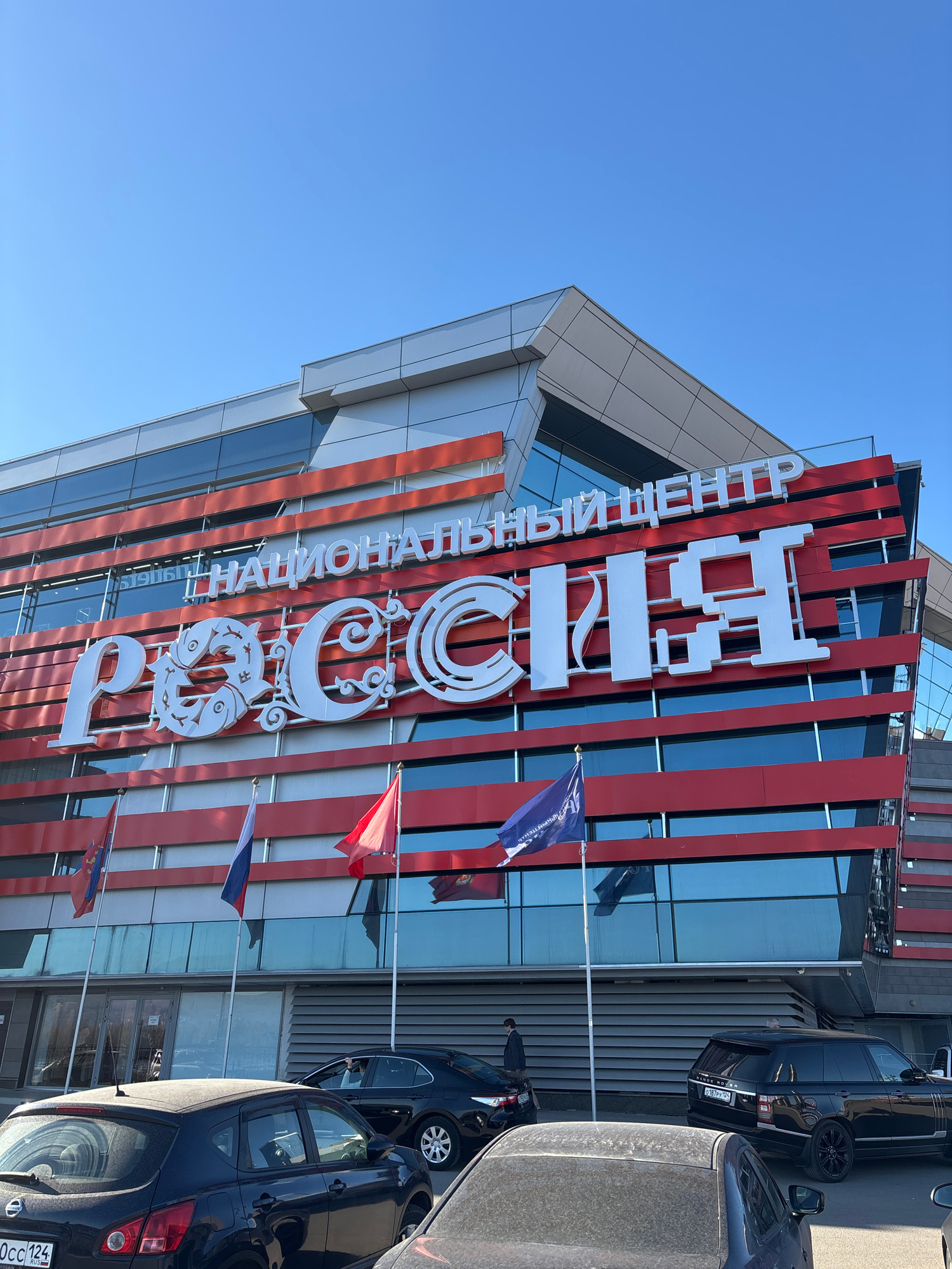 The image depicts the front facade of the "ROSSIA NATIONAL CENTER" building in Krasnoyarsk, Russia. The building features a modern architectural design with red and white stripes alternating across it…read more