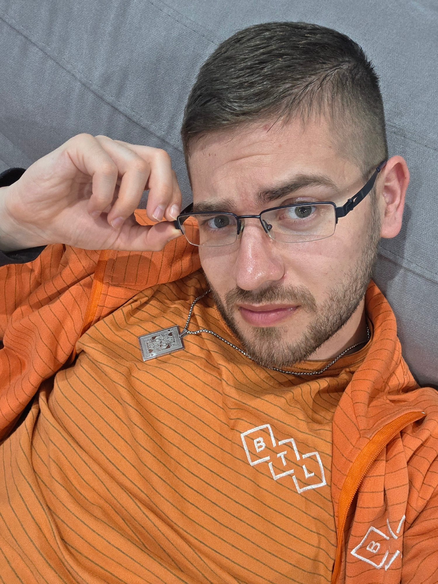 A Caucasian male lies on a gray surface, wearing an orange hoodie with white logos and thin gray stripes. He has a silver chain necklace with a playing card pendant. He is holding a pair of black-rimm…read more