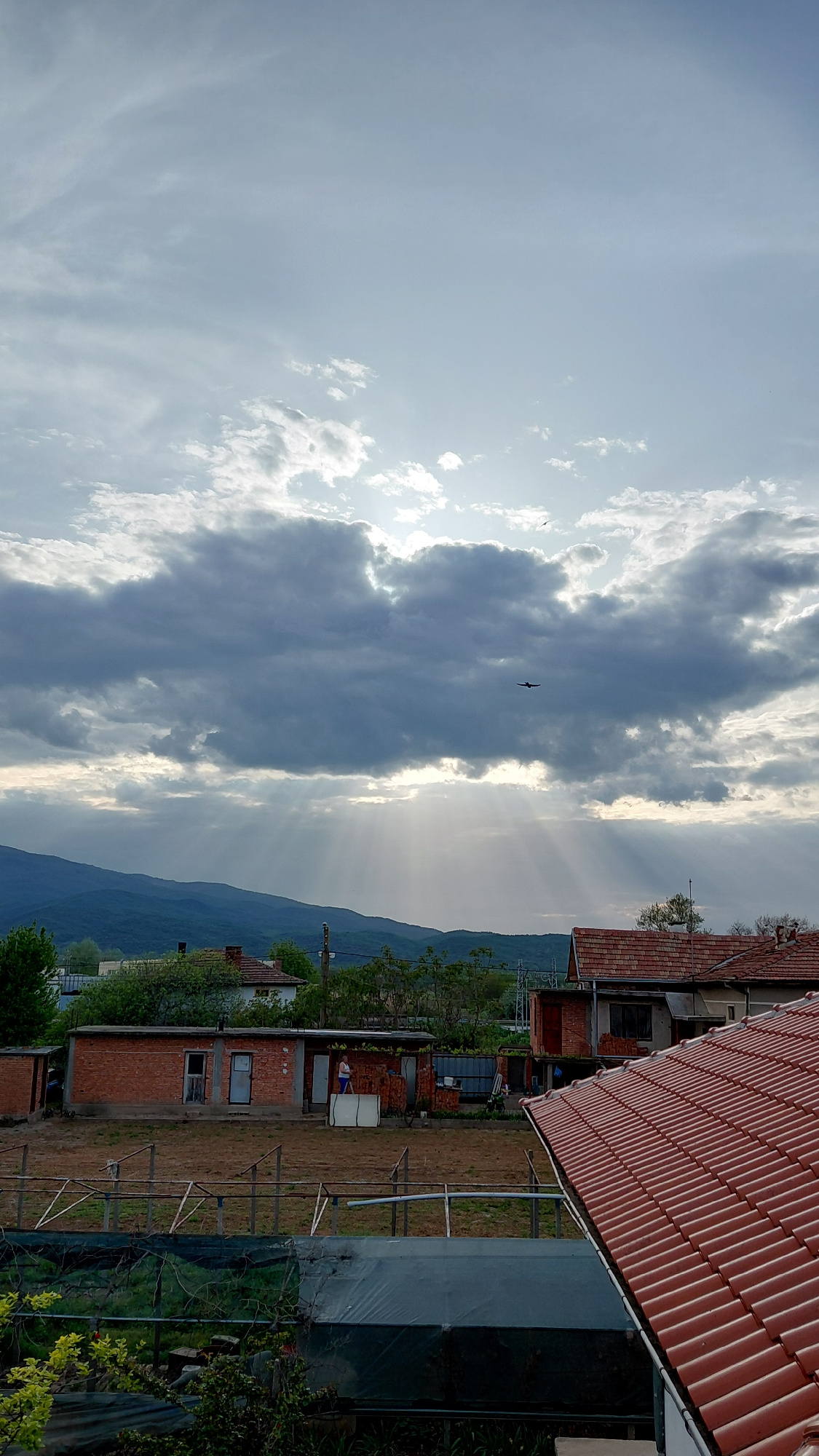 The image shows a rural landscape with a view of a mountain range under a cloudy sky with sunbeams. A bird is visible in the sky. In the foreground, there are buildings with red tiled roofs and brick…read more