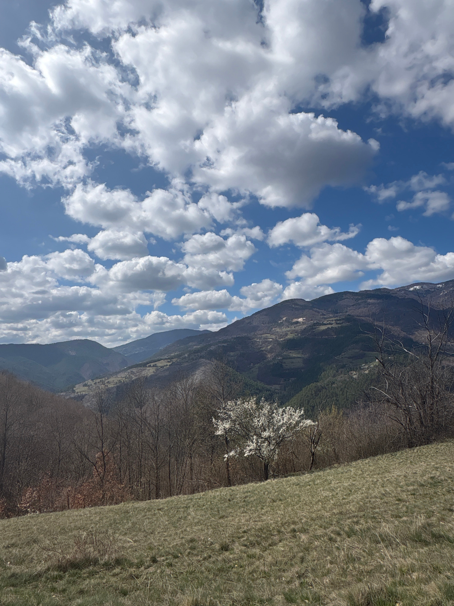 The image depicts a landscape in Kamenjani, Serbia. In the foreground, there's a grassy area. Moving inwards, there's a section of bare trees and a single tree with white blossoms stands out among theβ¦read more