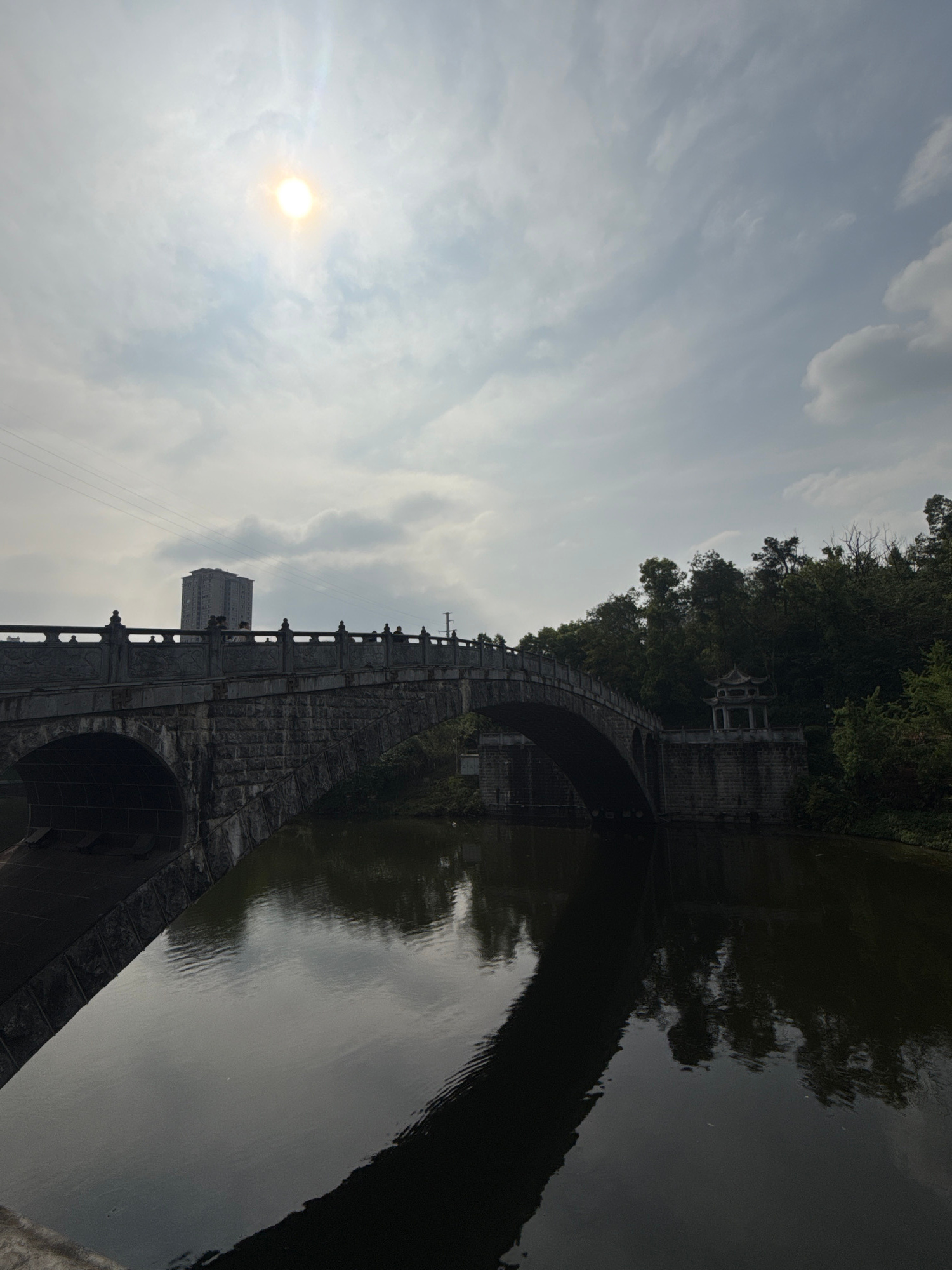 The image shows a stone bridge spanning a dark body of water, likely a river or canal. The bridge is constructed with arched openings and a decorative railing. On the far side of the bridge, there's vegetation and a small building. A modern building can be seen rising near the middle of the bridge. The sky is cloudy with the sun shining through. The image appears to be taken in Jiulongpo District, China, but this is only based on information provided and cannot be confirmed. | Open Wire