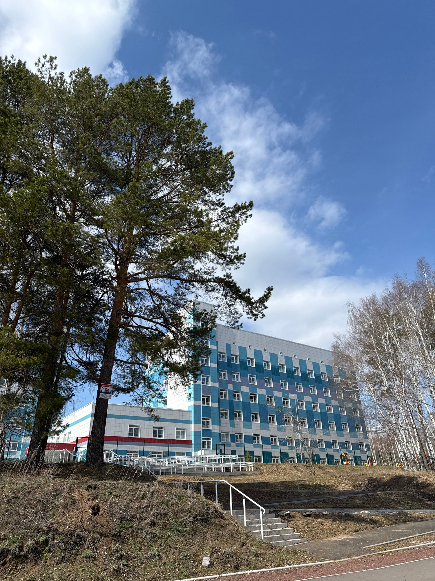 The image shows a view in Chaikovsky, Russia, likely taken in the spring. A tall, multi-story building with a blue and white checkered pattern on its exterior is prominent. A large pine tree stands in…read more