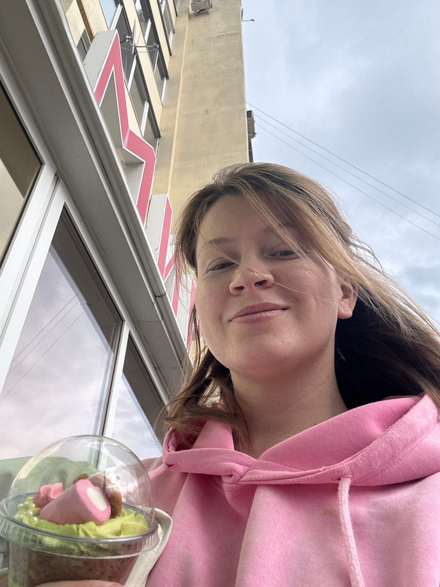 A young woman is featured in a close-up, slightly tilted photo taken outdoors in Chaikovsky, Russia. She has long, light brown hair and is wearing a pink hooded sweatshirt. She looks directly at the cā¦read more