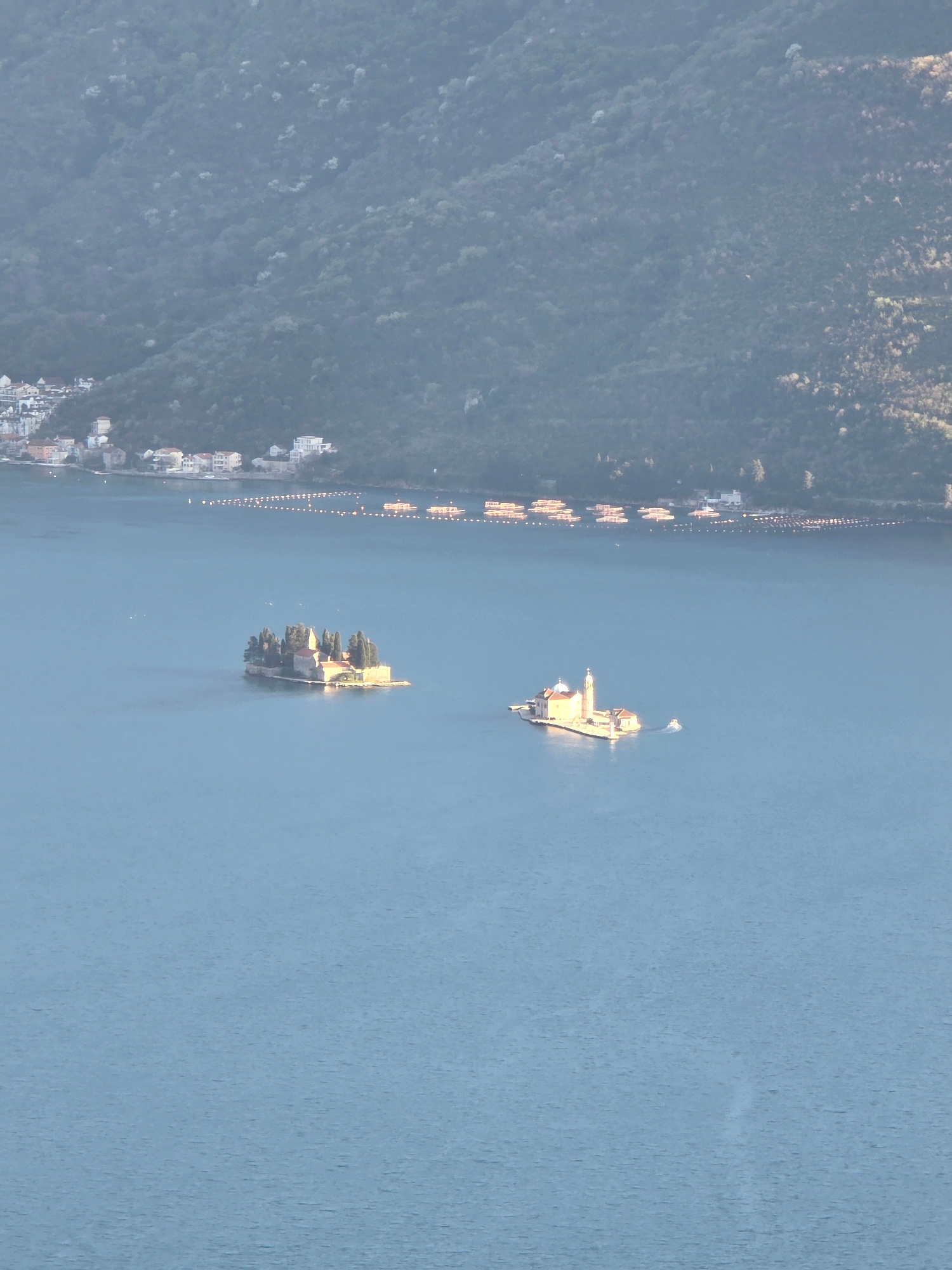 The image shows an aerial view of the Bay of Kotor, Montenegro, with the town of Strp visible along the left edge of the bay. Two small islands are in the water: one is Our Lady of the Rocks, a man-ma…read more