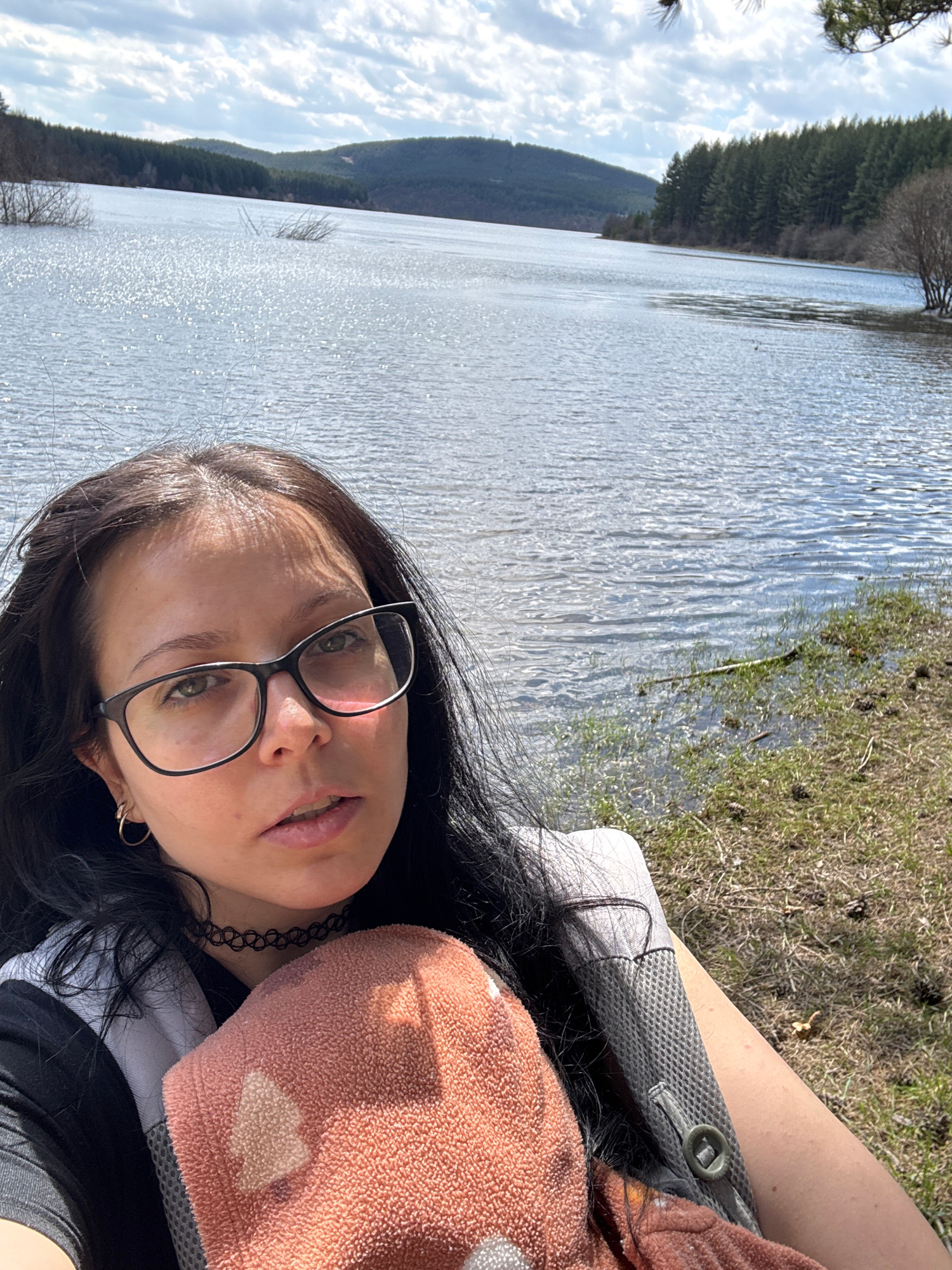A selfie of a woman with dark hair and glasses, possibly in her late 20s to early 30s, with a body of water in the background. The water is reflecting sunlight, and there are trees and a hill visible…read more