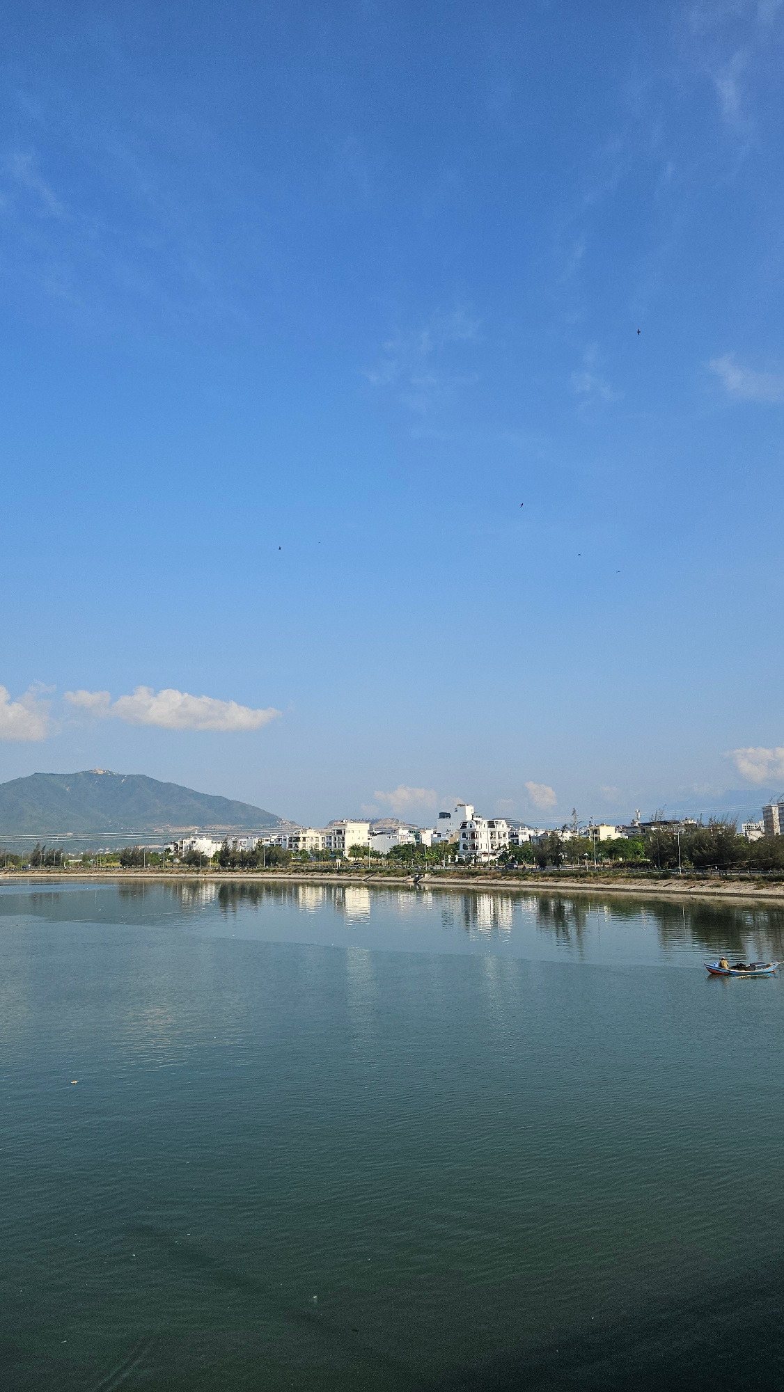 The image shows a body of water next to a shoreline in Nam Nha Trang, Vietnam. A road runs parallel to the water, lined with trees and buildings, many of which appear to be white. A mountain is visiblβ¦read more