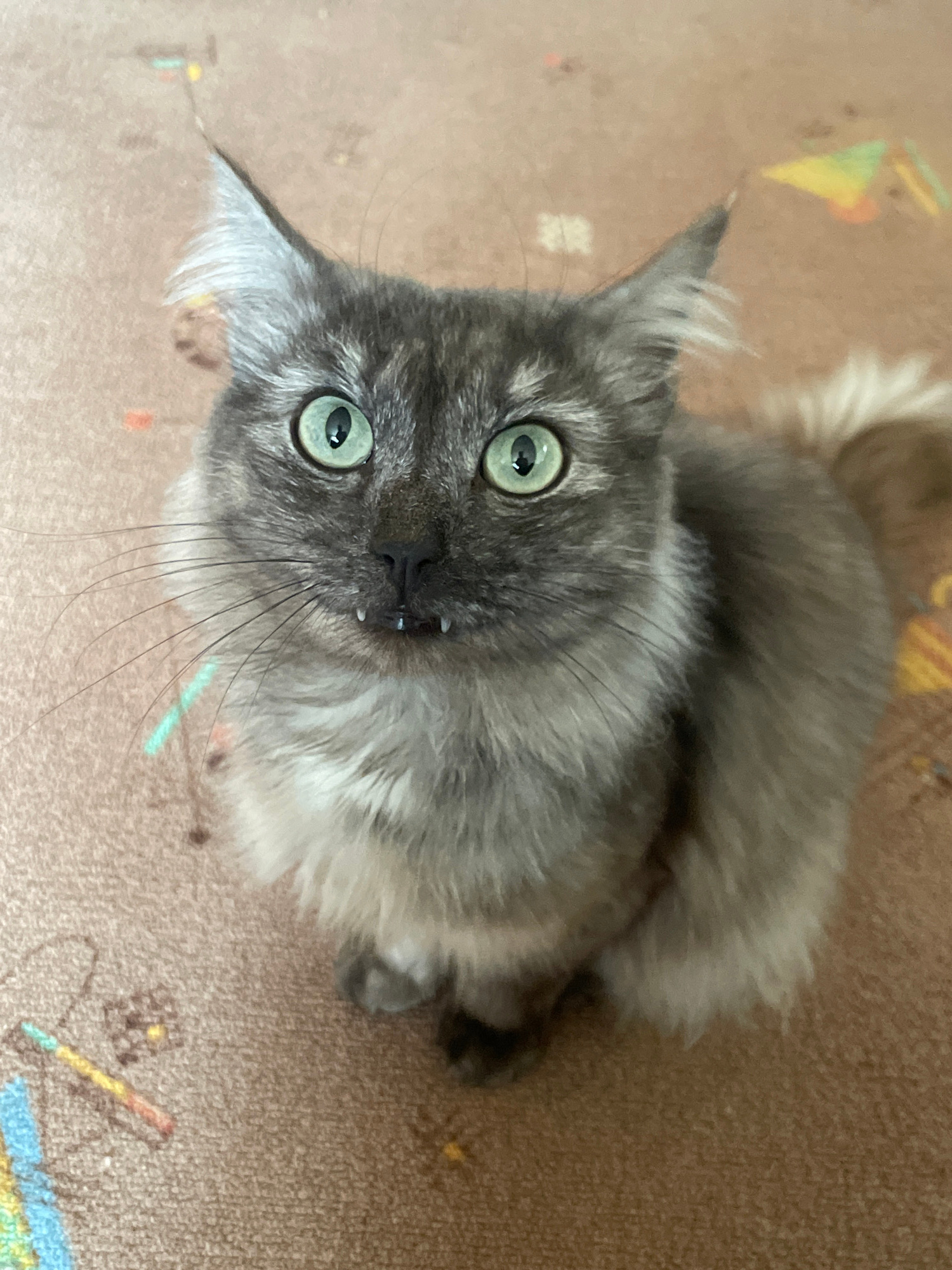 A gray cat with green eyes is looking up at the camera. The cat has long whiskers and slightly visible teeth. It is sitting on a patterned brown surface, possibly a rug or carpet. The location of the…read more