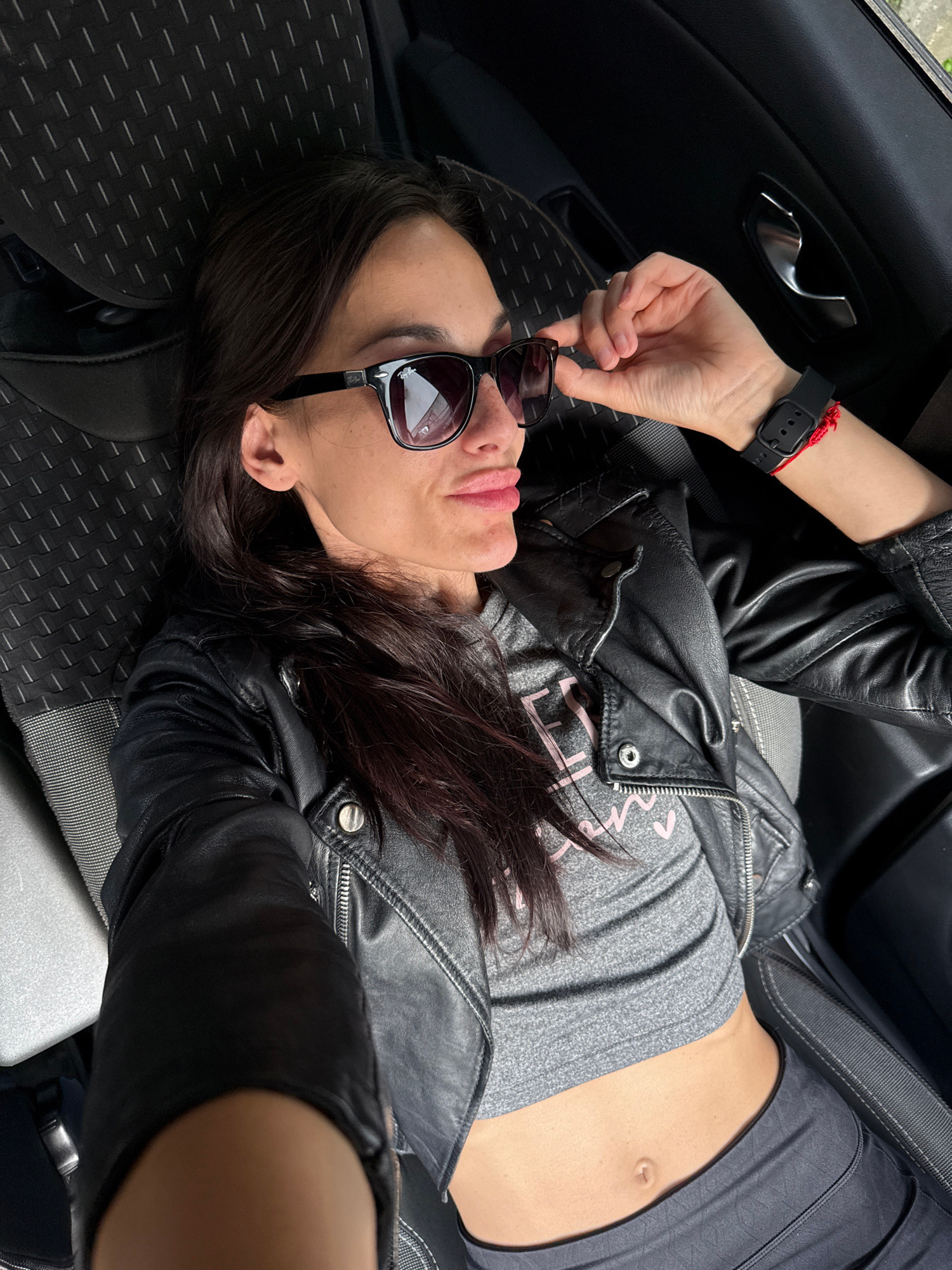 A woman lies in the backseat of a car. She wears a gray crop top and a black leather jacket. She is holding black sunglasses. The interior of the car is visible, including the door handle and patterne…read more