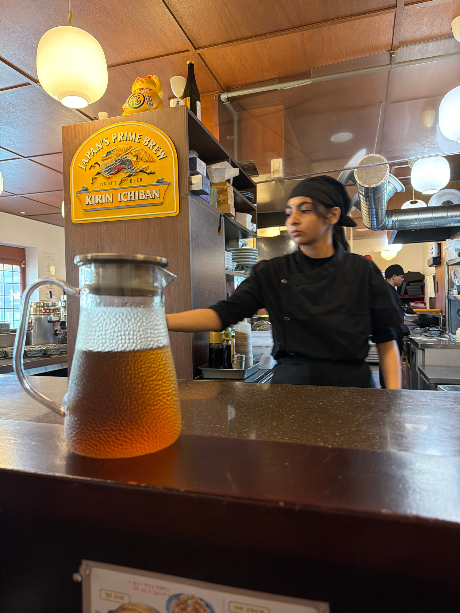The image depicts the interior of a restaurant, possibly in Busan, South Korea, based on the presence of a "Kirin Ichiban" sign, a Japanese beer brand. A person in a black uniform, likely a restaurant…read more