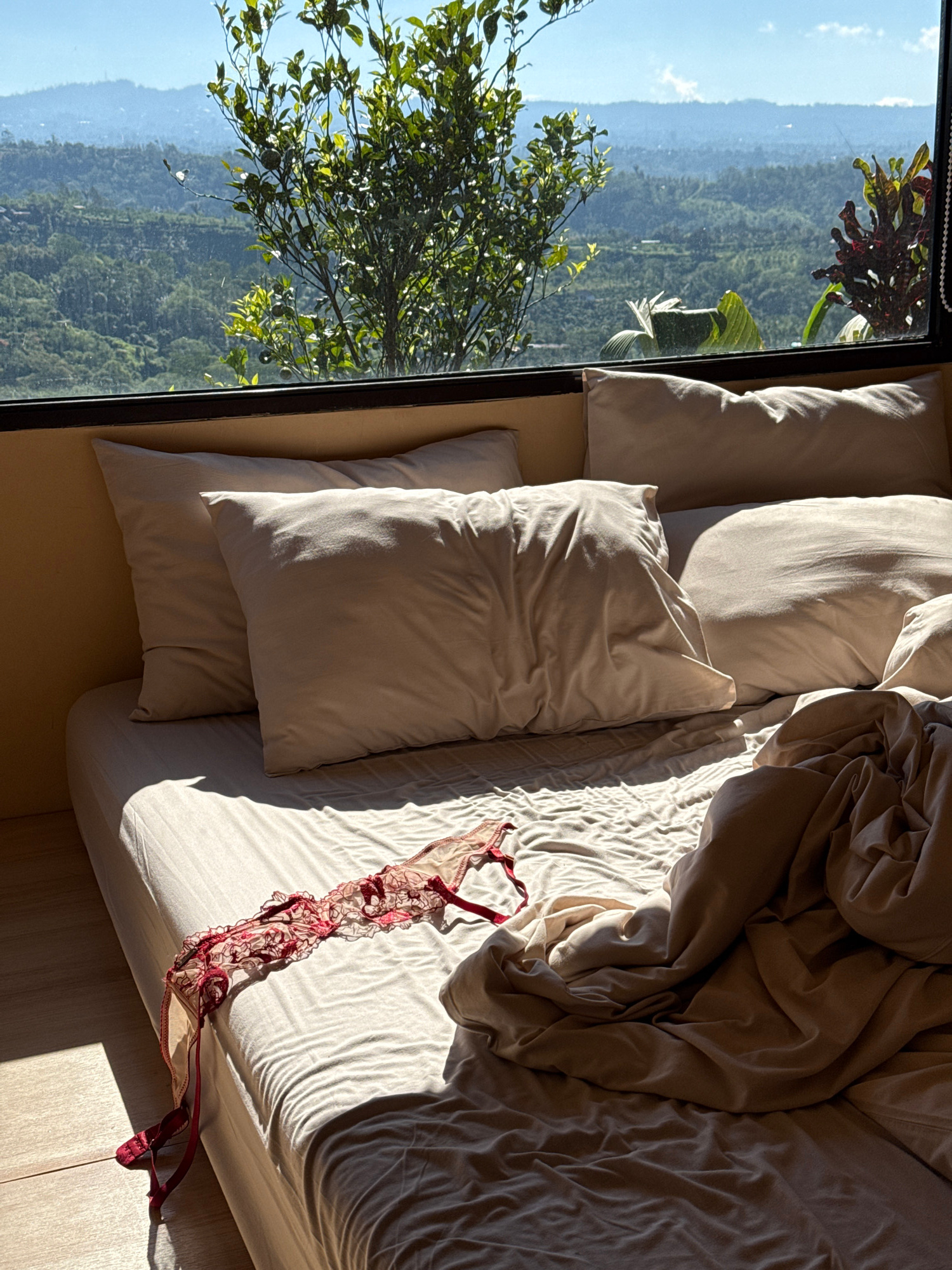 The image shows a bed situated near a window with a view of a lush landscape. The bed has several pillows and rumpled bedding, with a red lace garment lying on top. The window overlooks a mountainous…read more