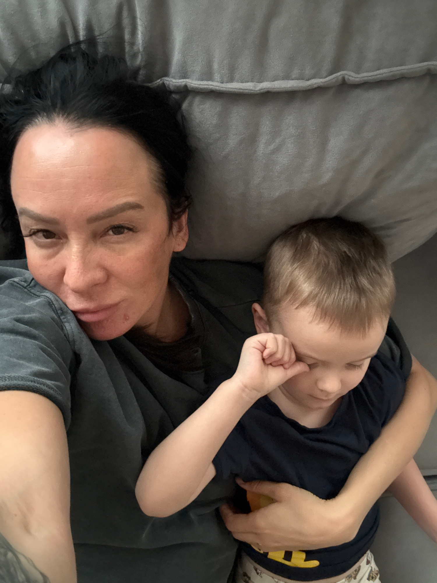 An overhead view captures an adult woman and a young child resting together on a grey, upholstered surface, likely a sofa or bed. The scene is set indoors in Chaikovsky, Russia. The woman is in the f…read more