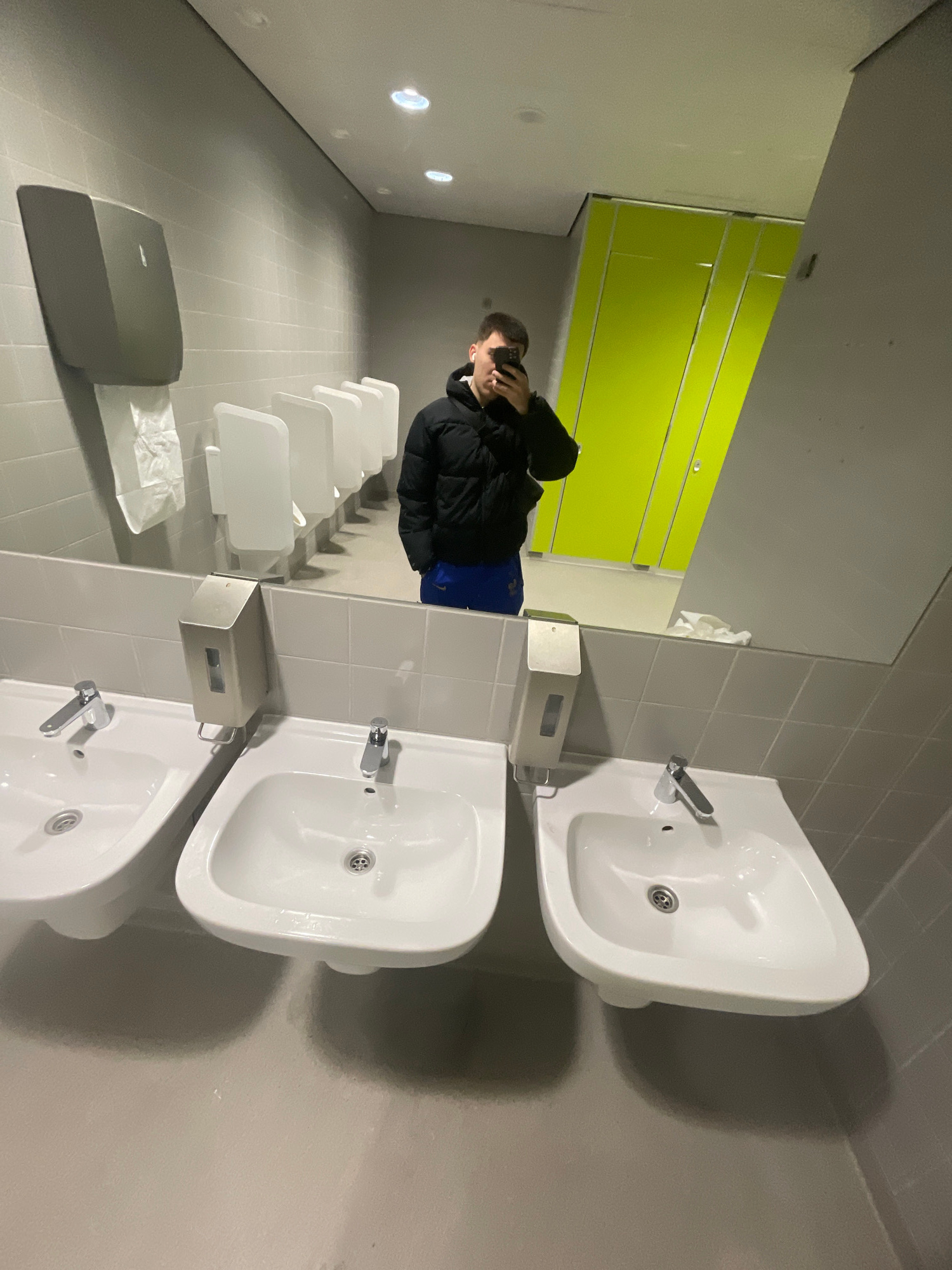 The image captures an interior scene of a public restroom in The Hague, Netherlands, featuring a man reflected in a mirror while taking a photo with his phone. The restroom includes a row of sinks wit…read more
