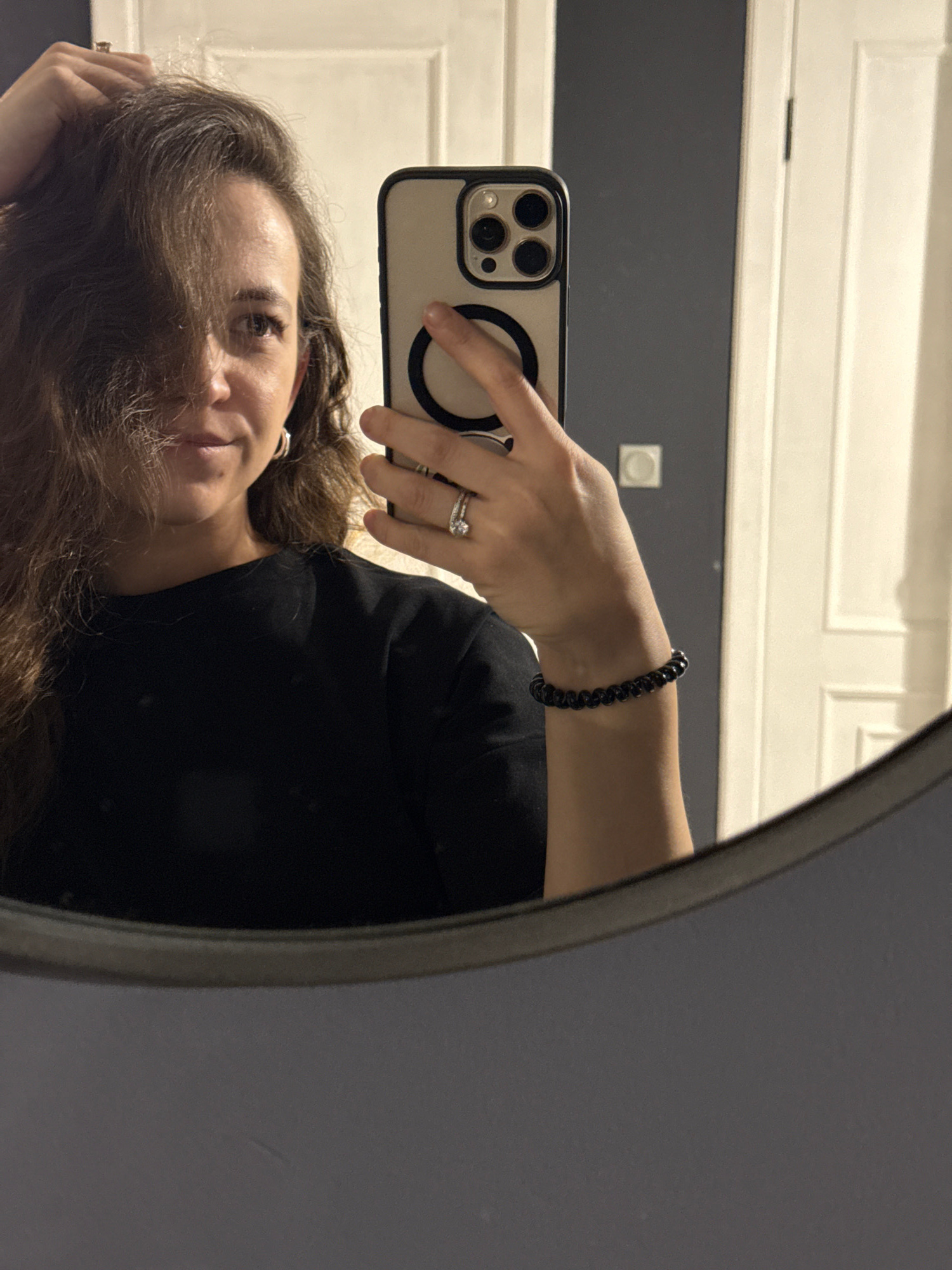 A person is taking a mirror selfie with a smartphone in an indoor setting. The image is rotated, showing the person's upper body and head from the chest up, reflected in a mirror with a dark frame. T…read more